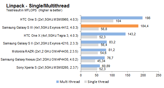 Även i Linpack går det bra för Exynos som återigen placerar sig ovanför Tegra 3. När det kommer till beräkningskraft per kärna märks det däremot klart och tydligt att det är en gammal arkitektur då One S rusar ifrån ordentligt. Linpack har dåligt stöd för fler än två kärnor vilket vi ser då varken Exynos eller Tegra drar iväg i multithread.