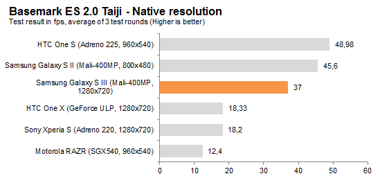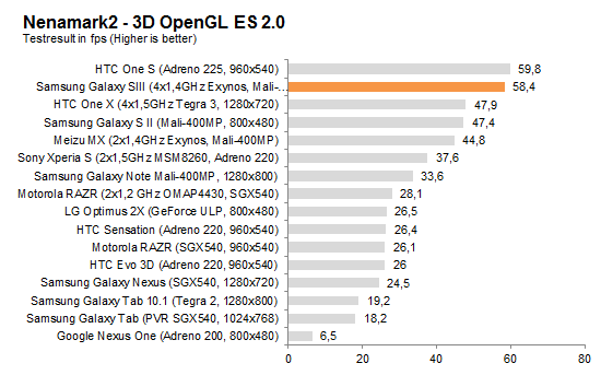 Även när det kommer till grafiktester som körs i telefonens naturliga upplösning presterar S3 bra, i Nenamark 2 har One S en knapp ledning trots att den använder sig av qHD upplösning.