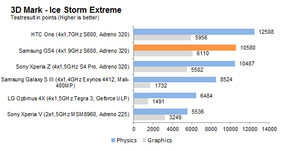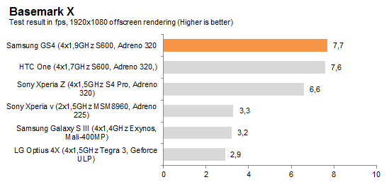 HTC One drar iväg ordentligt när det kommer till fysiktestet vilket är lite underligt då vi inte märkte av det under våra dedikerade CPU-tester. Vi fortsätter med Rightwares Basemark X som använder sig av spelmotorn Unity 4.0 som bland annat Madfinger använder till många av sina spel. Det är också vårt mest krävande grafiktest och trots att Galaxy S4 lägger sig i toppen är det inte långt ned till HTC som fortsätter att prestera bra.