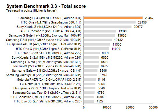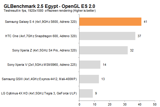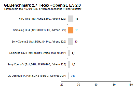 I vår recension av HTC One gick vi igenom nyheterna med Snapdragon 600 och vi kommer därför inte gå in på själva systemprocessorn utan istället titta lite på skillnaderna mellan Galaxy S4 och HTC One. Det finns tre skillnader som man kan se genom att titta på specifikationerna. Den märkbara skillnaden när det kommer till hårdvara är minnet av typen LPDDR3 istället för LPDDR2 som vi hittade i HTC One. Med en frekvens på 800 megahertz får vi en bandbredd på 12,8 GB/s vilket kan jämföras med HTC One:s 8,5 GB/s. Det är inte säkert att vi kommer få någon direkt fördel av en högre bandbredd men på krävande GPU-tester i en hög upplösning är det möjligt att vi får ett bättre resultat.