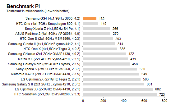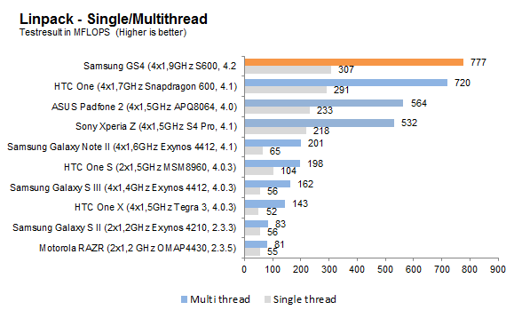 Galaxy S4 presterar bästs på alla punkter i vårt första test men när det kommer till RAM är resultatet bara ett fåtal procent högre än vad vi får med HTC One. Fortsätter vi med Linpack blir skillnaderna mindre vilket delvis beror på att Linpack börjar bli gammalt och presenterar ojämna resultat