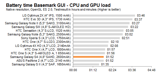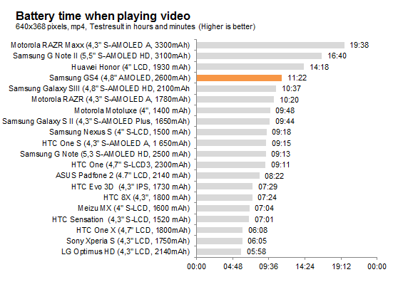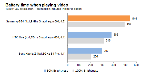 Galaxy S4 placerar sig högt i våra tester med en batteritid på 11 timmar och 22 minuter på vårt standardtest. Tittar vi istället på det lite mer krävande testet i form av en upplösning på 1920×1080 pixlar, en bitrate på lite över 9000kbps samt två inställningar för ljusstyrka visar Amoledskärmen ytterliggare en styrka, hur lite batteritiden påverkas av att ljusstyrkan höjs under videouppspelning.