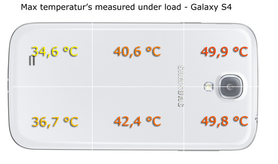 Temperaturerna är förvånansvärt lägre än vad vi fick med HTC One, en del av förklaringen är att vi mäter temperaturen på baksidan och då är skärmens värmeutveckling inte lika märkbar. Den märks däremot av när man belastar telefonen och sedan väljer att ta ett samtal. Gillar man att spela spel och samtidigt ha hög ljusstyrka föreslår vi därför att man väntar med att svara eller håller telefonen på avstånd. Även vid normalt användande är Galaxy S4 betydligt svalare än HTC One.