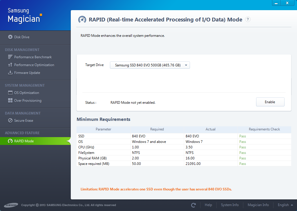 För att kunna använda Rapid så krävs ingen särskild hårdvara. Men först och främst så måste man ha en Samsung-SSD av nyare modell. Initialt så är det endast 840 Evo som fungerar men vi har fått bekräftat att även 840 Pro kommer att få stöd. Troligtvis kommer alla framtida modeller av Samsungs SSD-enheter också att stödjas. Det finns också en del begränsningar som gör att det inte är möjligt för alla att använda det (se punktlista här nedanför). Sedan krävs det att man installerar Samsung Magician version 4.2 (som ännu inte är släppt officiellt). I Magician så kan man enkelt slå på Rapid med en knapp. Efter det så är det endast en omstart som kärvs, och sedan är man igång. Installationen är mycket simpel och Magician har faktiskt vuxit till sig och blivit ett bra programvara som håller reda på din SSD åt dig. Förutom detta så är det några saker man bör tänka på innan man sätter igång.
