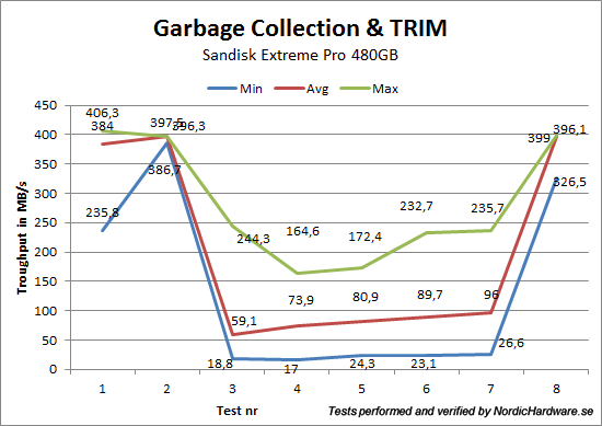 Det känns som om Sandisk har gjort en del förändringar i sin Garbage Collection jämfört med Extreme 2. Här ser vi att enheten tappar rejält med prestanda efter vårt tortyrtest för att sedan sakta men säkert återhämta sig. Detta tyder på en mer passiv Garbage Collection än vad vi tidigare sätt. Enheten väljer att försöka hålla maximal prestanda så länge det bara igår istället för att städa “lite vartefter”. I praktiken borde det inte spela så stor roll eftersom enheten aldrig kommer att hamna i det här läget om man inte skriver till den konstant (vilket är väldigt ovanligt utanför serverhallen). I vanlig ordning så återställs prestandan till fullo när TRIM körs.