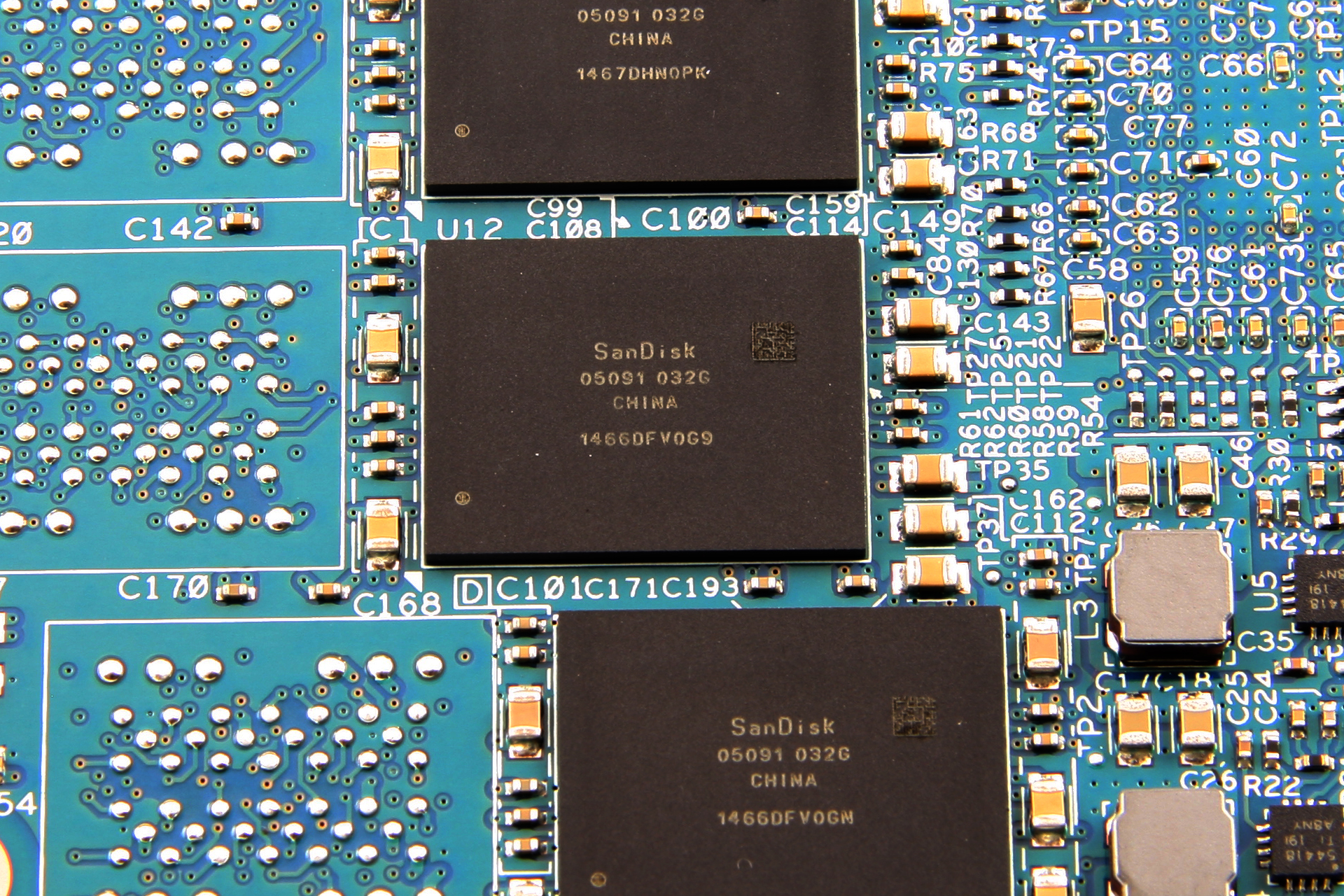 På vårt testexemplar av SanDisk Extreme 120GB så hittar vi endast 4st minneschip med beteckningen 05091 032G. Vi har tyvärr inte lyckats få tag i några specifikationer eller data på minnena, men med hjälp av det vi vet så kan vi räkna ut en del saker. Vi vet att enheten har 128GB totalt utrymme som är delade över 4st chip. NAND-enheter som är tillverkat med 24/25nm brukar ha 4GB lagringskapacitet. Det skulle i så fall innebära att SanDisks chip innehåller 4 NAND-enheter per chip. Troligtvis så kommer 240GB versionen att vara identisk, men ha 8st minneschip istället för 4.