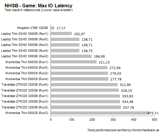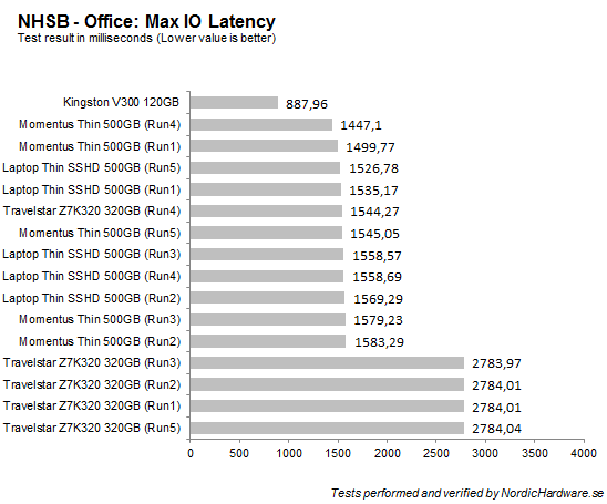 Även om majoriteten av alla IO blir klara på under 10 millisekunder så finns det enstaka som tar väldigt lång tid. Om dessa är för långsamma så kan det upplevas som hack eller ryck. Givetvis vill man att dessa toppar ska bli så små som möjligt. Även här är SSD-enheten överlägsen. SSHD-enheten presterar bra och det lilla NAND-flash som finns, hjälper till att sänka den maximala latensen något.