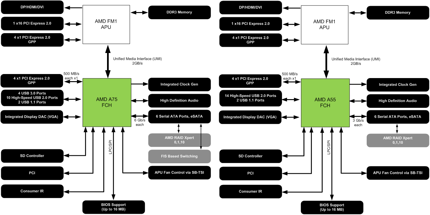 Tillsammans med Llano släpptes två olika styrkretsar, eller sydbryggor. AMD väljer dock att kalla dessa för FCH som i “Fusion Controller Hub” vilket är ytterliggare ett testamente på att företaget tror att heterogena lösningar där CPU och GPU arbetar tillsammans är framtiden.