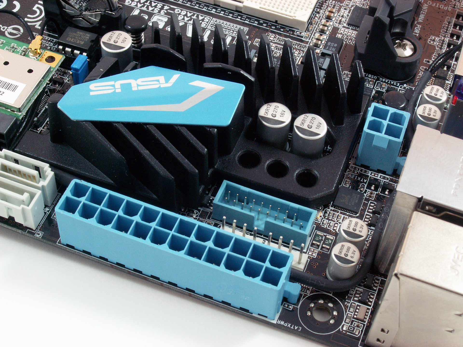 Ska vi återigen kika närmare på själva moderkortet och dess layout är det som väntat ganska trångt. Men ASUS har gjort et bra jobb med att trycka in en stor mängd funktionalitet på liten yta. Kortet har dubbla DDR3-minnesplatser, en ensam PCIe x16 port för grafikkort samt dubbla strömkontakter väl placerade i ovankant av moderkortet. Antalet analoga ljudanslutningar är begränsade men de tre portarna stödjer 8-kanals ljud och vi förmodar att de flesta som köper detta kort använder sig av en digital ljudanslutning.