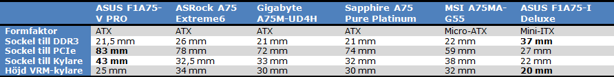 Som vi ser i tabellen ovan skiljer det en hel del mellan de olika moderkorten och generellt är det ASUS F1A75-V Pro som klarar sig bäst. Med både mest utrymme till spänningskylare och närmaste PCIe x16 plats. Men är man extremt rädd för sina minnesmoduler har ASRock lyckats göra det riktigt rymligt mellan dessa och processorsockeln.