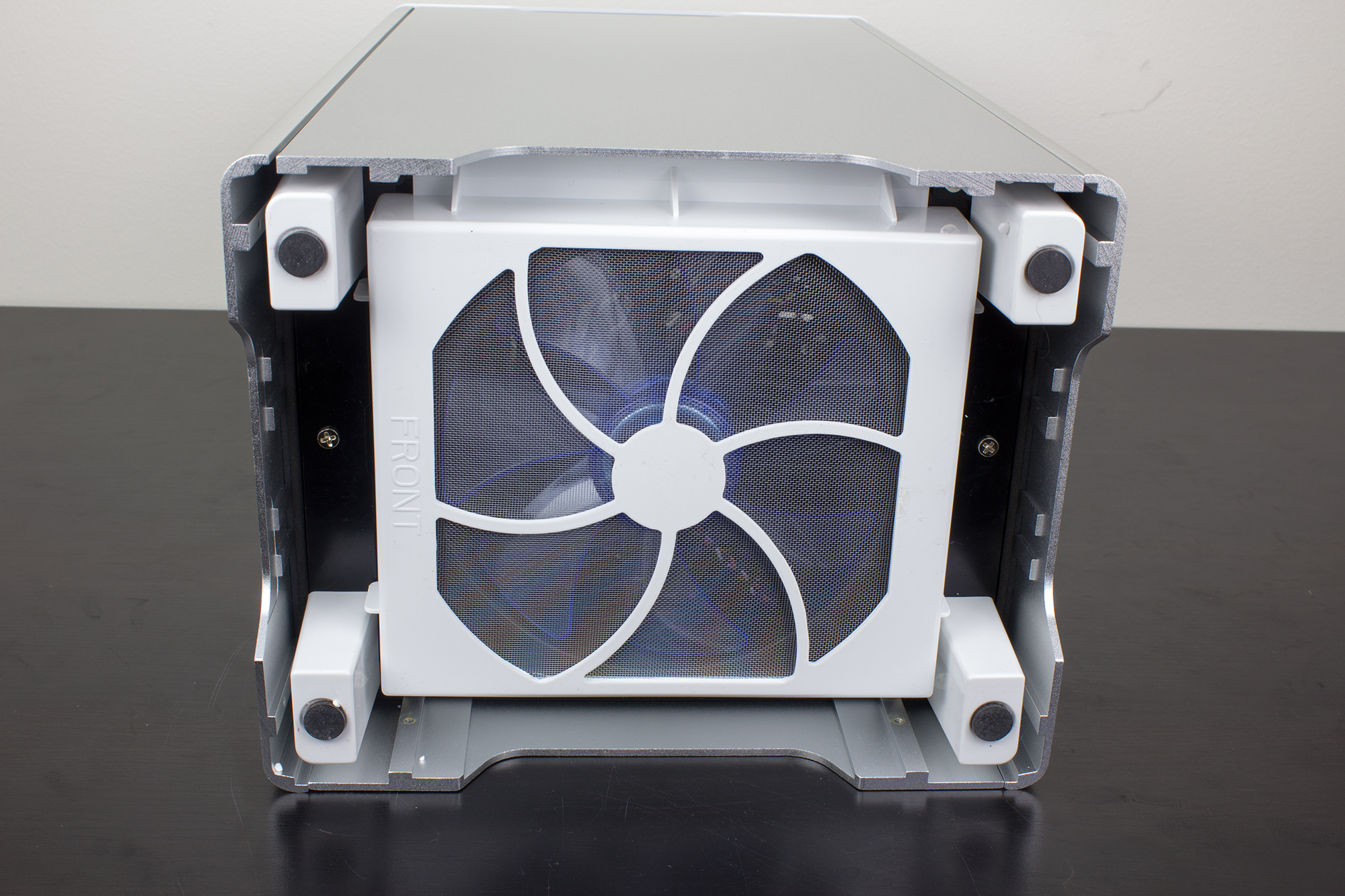Sidorna på chassit har inga platser för fläktar eller liknande, utan här syns bara utrymmet längst upp för att underlätta avtagning av gallret i toppen och ett luftintag i botten för att ge den bottenmonterade fläkten luft.