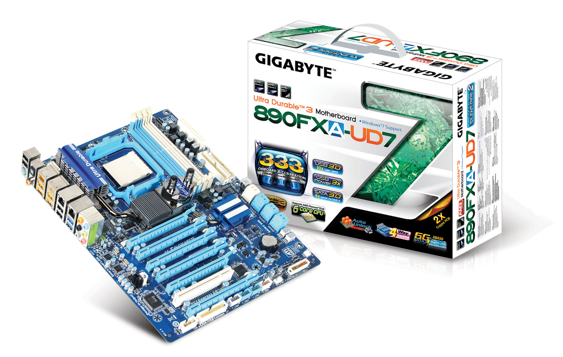 Gigabyte har även sett till att ge sina grafikkortsflaggskepp lite passande sällskap. Varje kort akompanjeras av varsitt Gigabyte 890FXA-UD7 moderkort. Toppmodellen på Gigabytes Socket AM3 plattform som bjuder på bred funktionalitet. Förutom stöd för sexkärniga Phenom II X6 processorer hittar vi USB 3.0, SATA 6,0 Gbps, Ultra Durable 3, sex grafikkortsplatser och gedigna överklockningsfunktioner.
