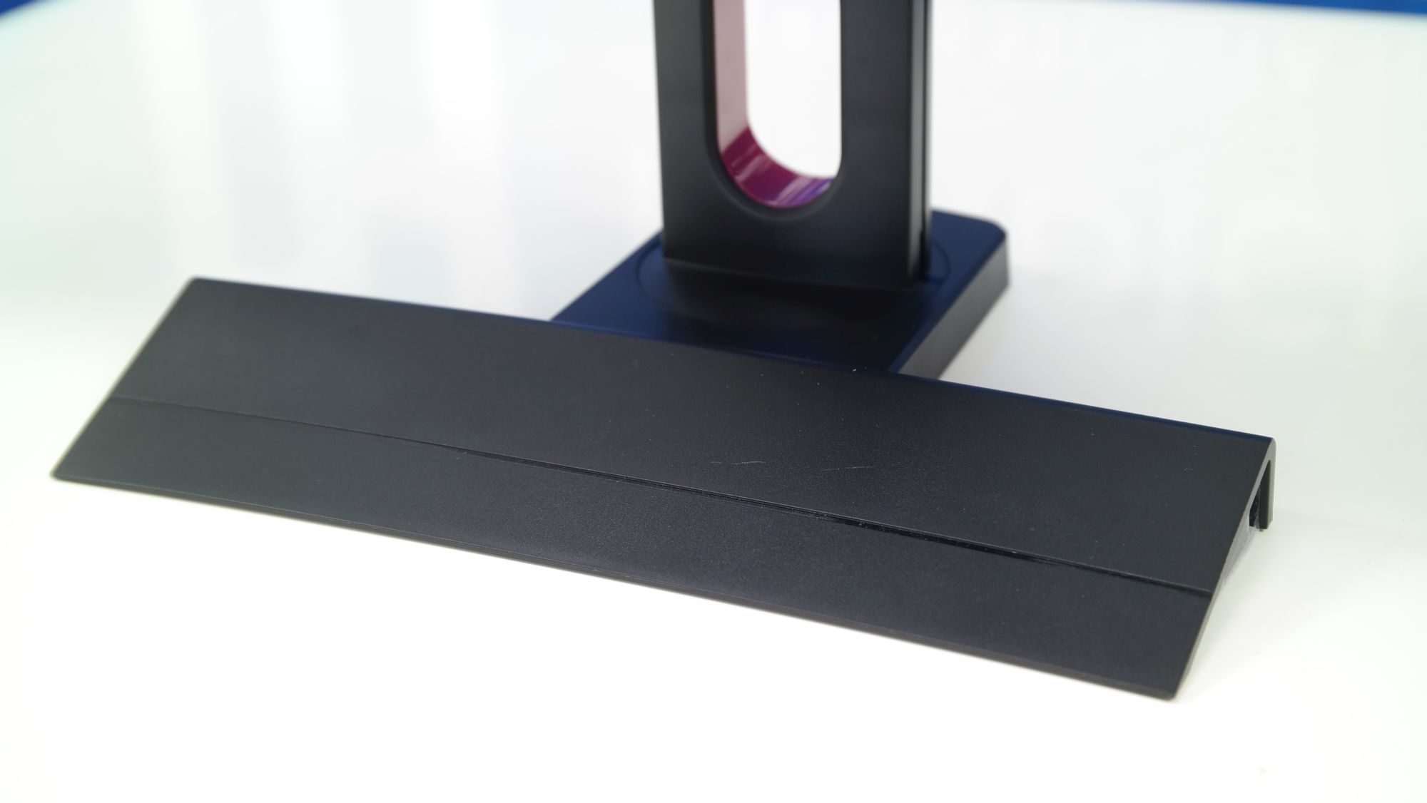 Foten som skärmen står på är av samma matta plast som resten av skärmen och står stabilt på bordet. Storleksmässigt är den sparsamt designad och man har valt att gå på bredden istället för på djupet för att få så bra stabilitet som möjligt. Detta är en bra lösning som fler skärmtillverkare borde titta på.