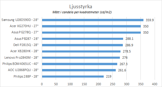Däremot finns det lite mer markanta skillnader när vi ser till den maximala ljusstyrkan. Samsung toppar listan med sin U28D590D och det med god marginal – skillnaden märks även av i reell användning. Dell, Asus, Lenovo och AOC ligger alla ganska nära varandra i ljusstyrka, och av dessa är den största avstickaren Lenovo med sin högblanka yta. Philips trillar in längst ner på listan men känns inte för ljussvag, annat än om du använder den nära ett fönster med starkt solljus.