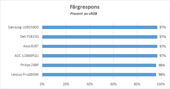 Tre av de deltagande skärmarna – AOC U2868PQU, Asus PB287Q och Samsung U28D590D – är specificerade till 1 millisekunds responstid, medan övriga specificeras till 5 millisekunder. Vad som dock är viktigt att påpeka är att responstid är en term som kan missuppfattas. Den responstid som presenteras av tillverkarna presenterar hur snabbt pixlarna i skärmen kan skifta mellan olika färger och nyanser, där det vanligaste måttet är grått-till-grått. Vad som är mer intressant för spelare är dock input lag, som mäter hur lång tid det tar från dess att du skickar ett kommando (exempelvis rör på musen), till dess att du faktiskt märker av förändringen på skärmen. Den siffran presenteras sällan eller aldrig av tillverkaren.