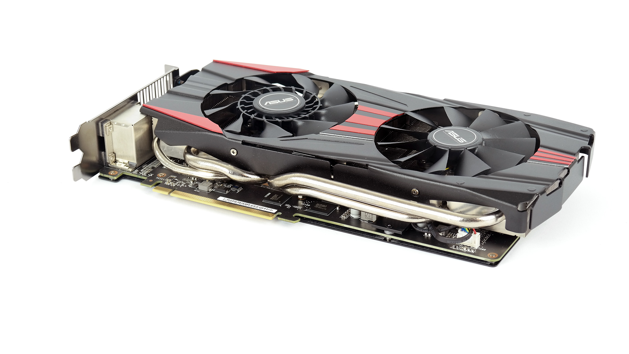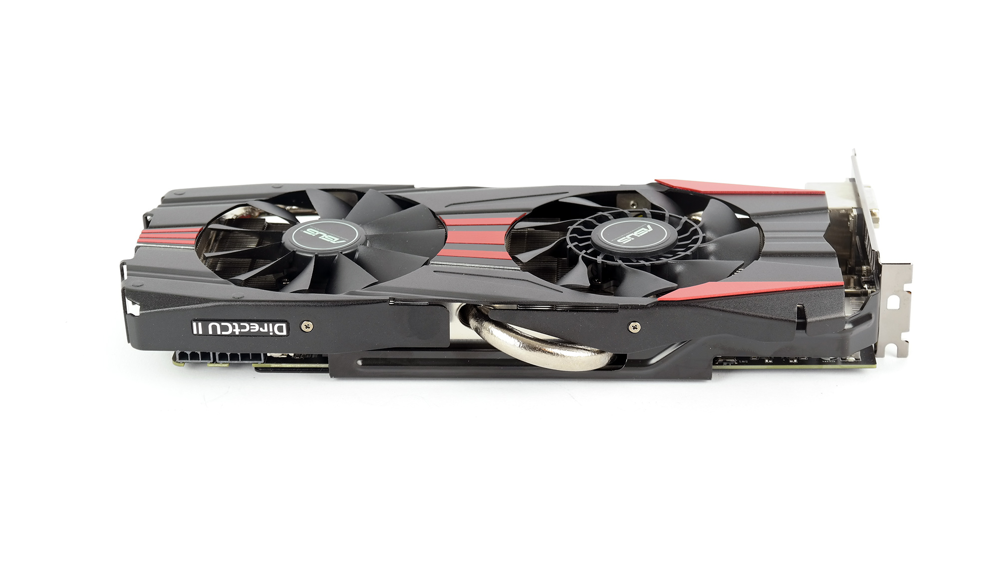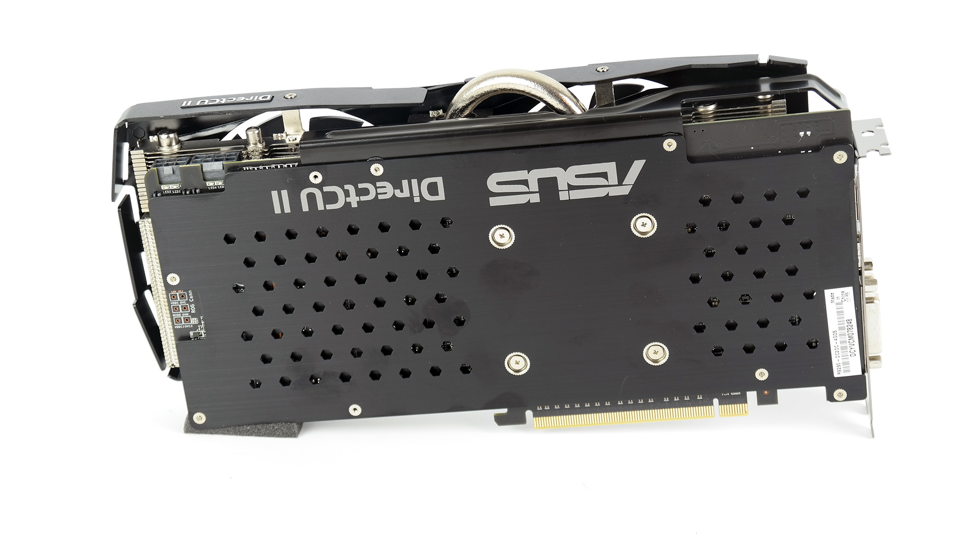 Precis som på företagets andra DirectCU II-kylare rör det sig om två stora fläktar på 92 millimeter. Kylaren använder sig även av en rejäl kopparbas från vilken det löper en rad stora värmerör varav åtminstone en är hela 10 millimeter tjock. Dessutom har kortet utrustats med spänningsmätpunkter i kortets bakre del, en digital spänningsdel och strömförsörjning genom 8+6-pinskontakter. Värt att nämna är att den bakre fläkten är av Asus hybridtyp cooltech som kan sägas vara en blandning av en radial och en axialfläkt och påstås ge bättre förmåga att trycka ner en större volym luft genom kylflänsarna. Kretskortets baksida pryds av en rejäl backplate som även hjälper till med att stödja kortet vid och efter montering.