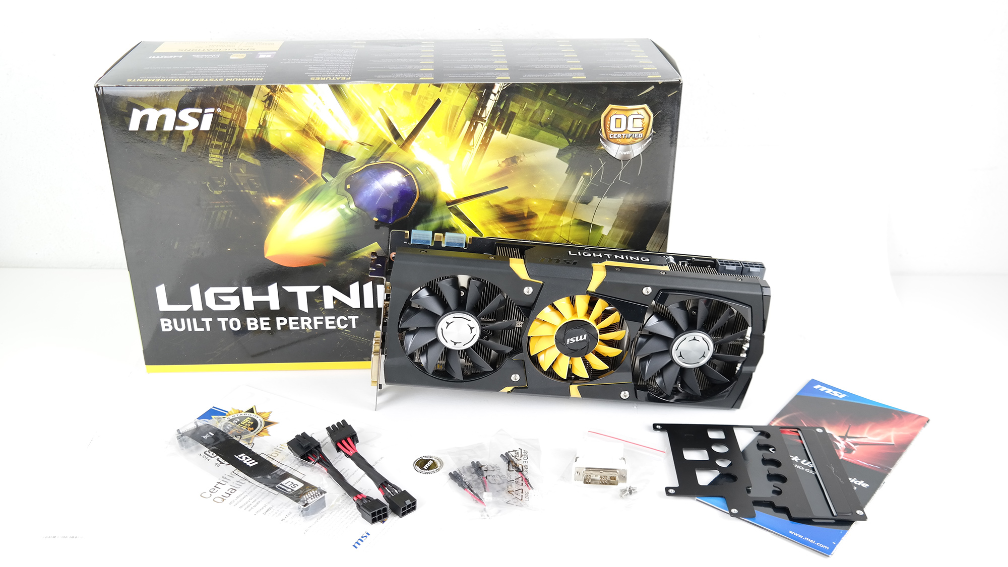 MSI GTX 780 Lightning kommer med några extra godsaker i kartongen, extra lång SLI-kabel, strömkablar, en kylningsplåt för LN2-kylning, DVI-adapter, kvalitetscertifikat samt kablar för att lättare mäta spänningen på kortet med en extern multimeter.