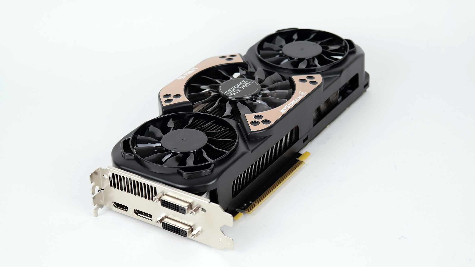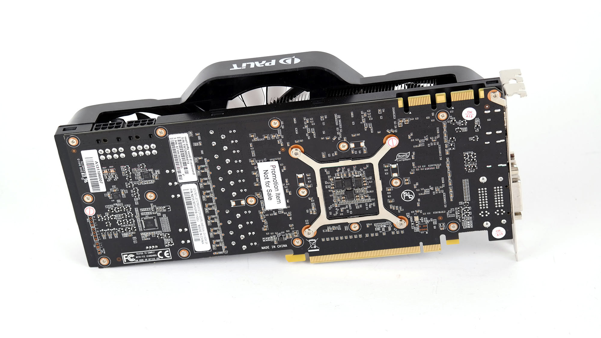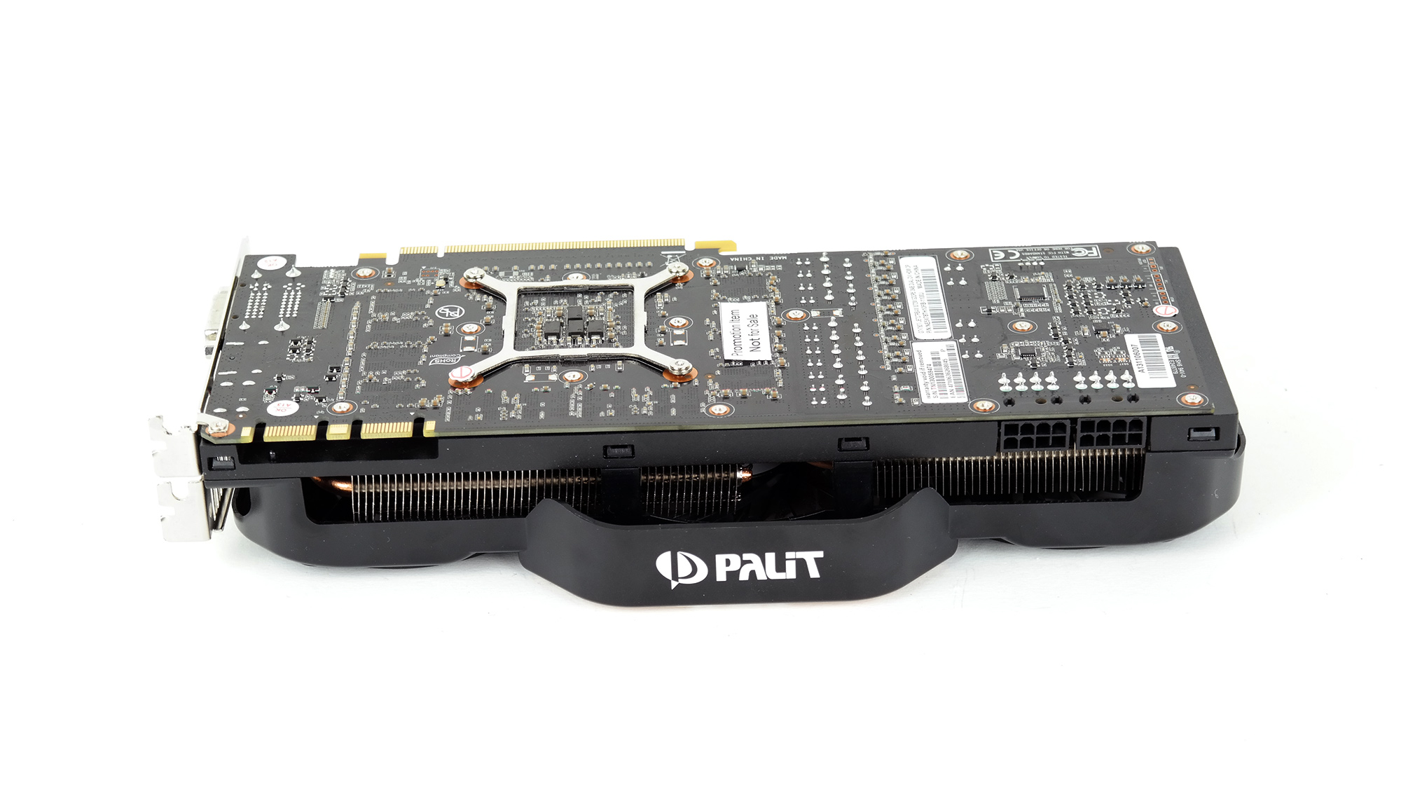 Palit har även sett till att uppgradera kretskortet där man tryckt in en spänningsdel med 8 faser och dubbla 8-pins strömkontakter för att förse kortet med tillräckligt med ström. Kortets svarta PCB matchar också den svartguldiga kylaren väl och huserar som väntat även två SLI-kontakter. Videoutgångarna består som sig bör av dubbla DVI, HDMI samt Displayport.