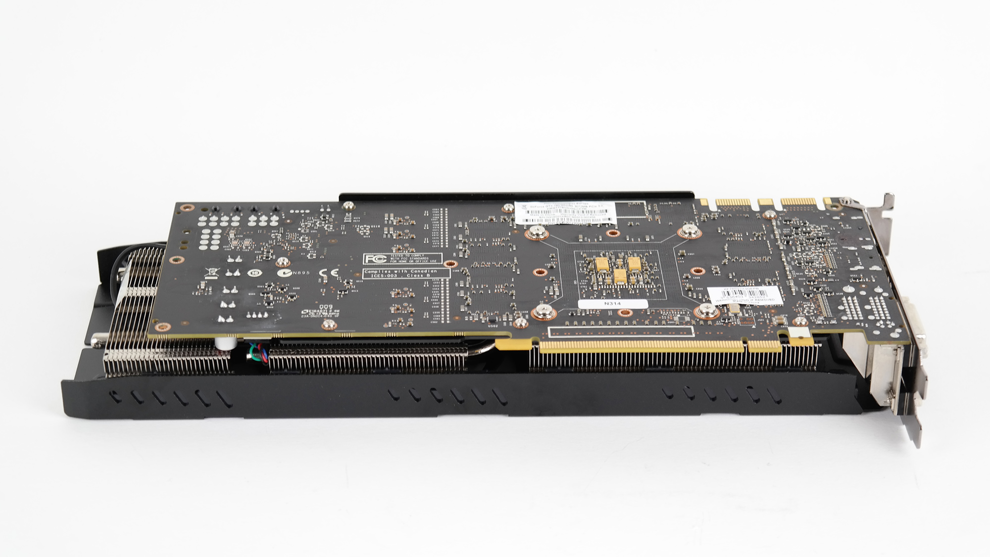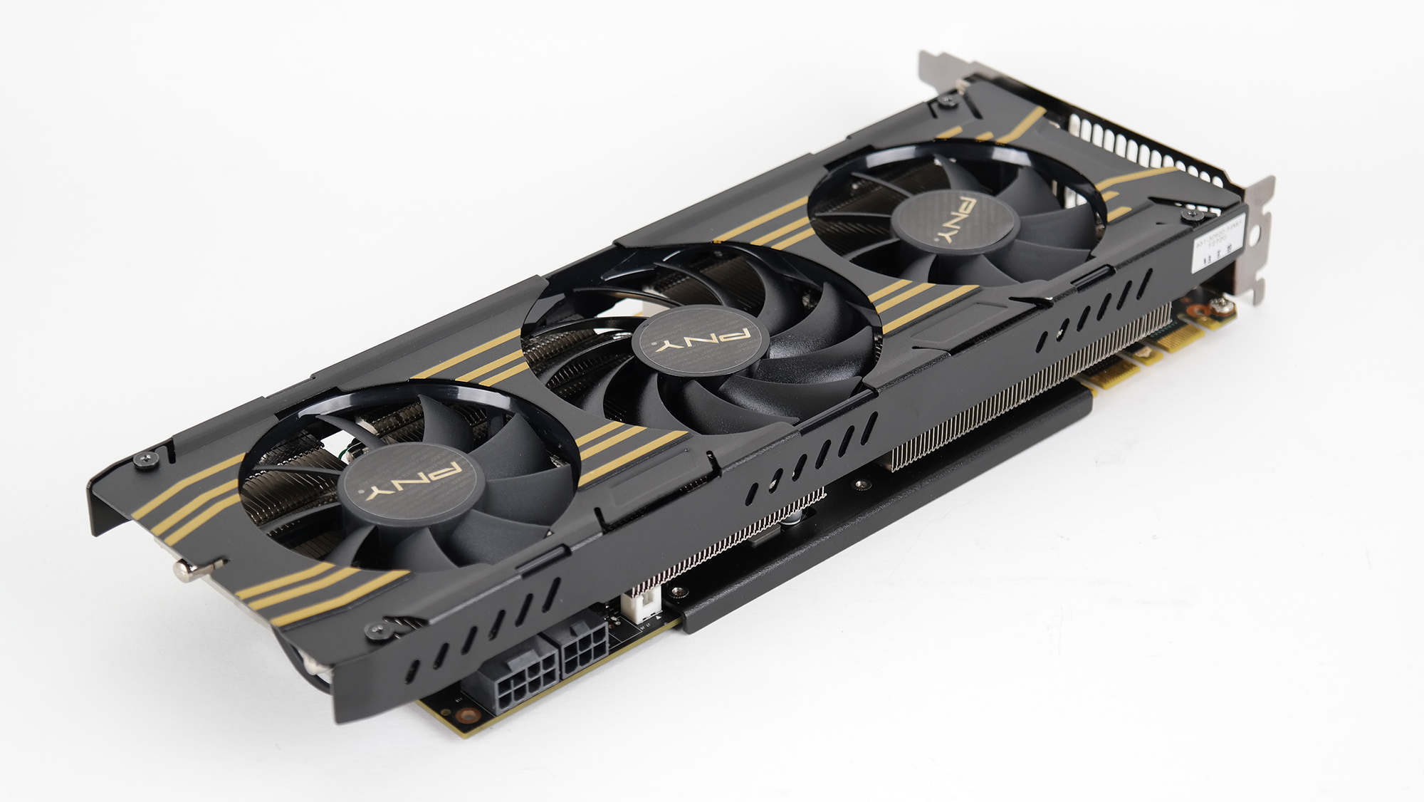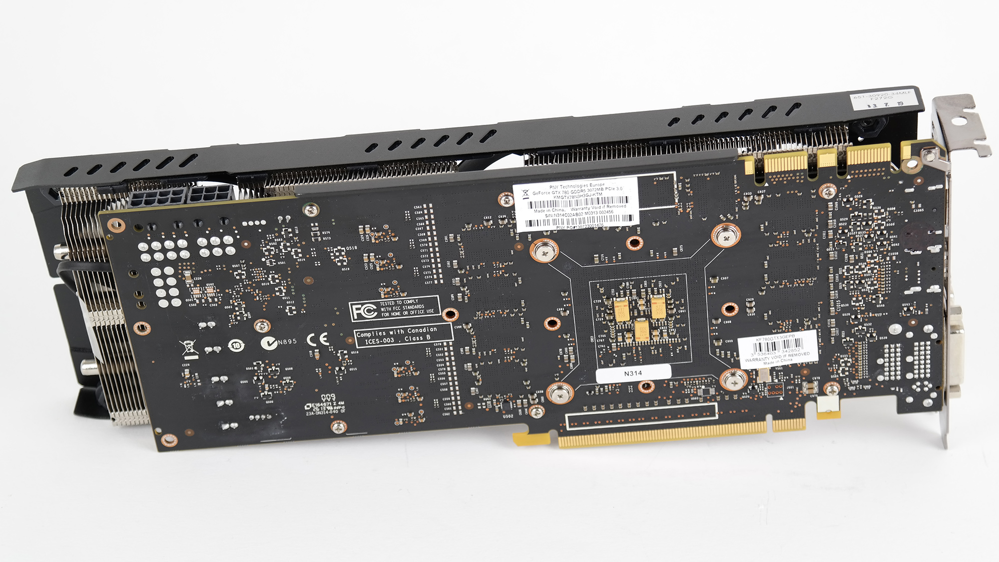 PNY:s kretskort är något kortare än själva kylaren, som sticker ut någon centimeter i kortets bakkant. I övrigt märker vi dock ingenting utöver det vanliga, med en 6-pins och en 8-pins strömkontakt som standard med montering längs med kortets sida i motsatt del från de två SLI-kontakterna. Vi hittar även de vanliga videoutgångarna, två DVI varav en DVI-I och en DVI-D, en HDMI samt en Displayport.