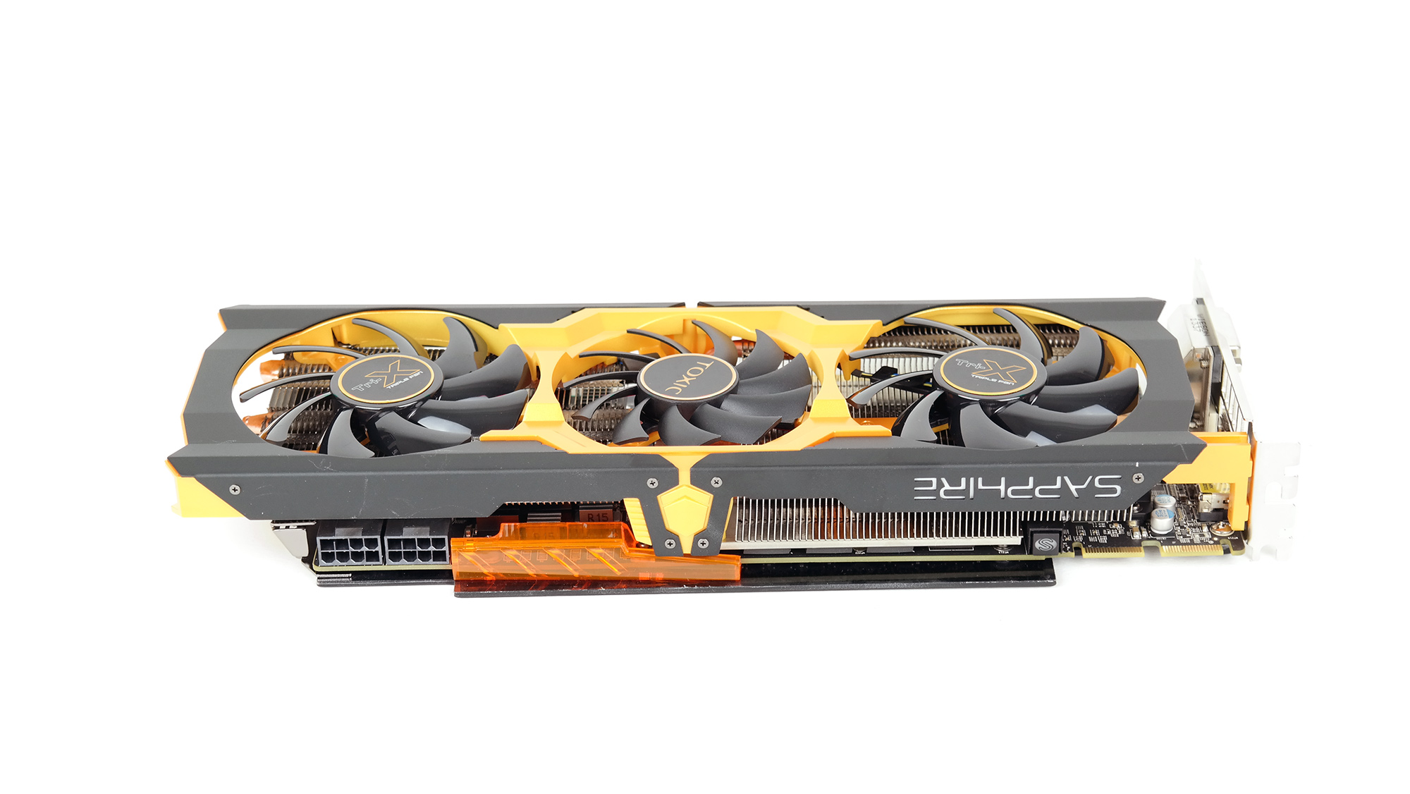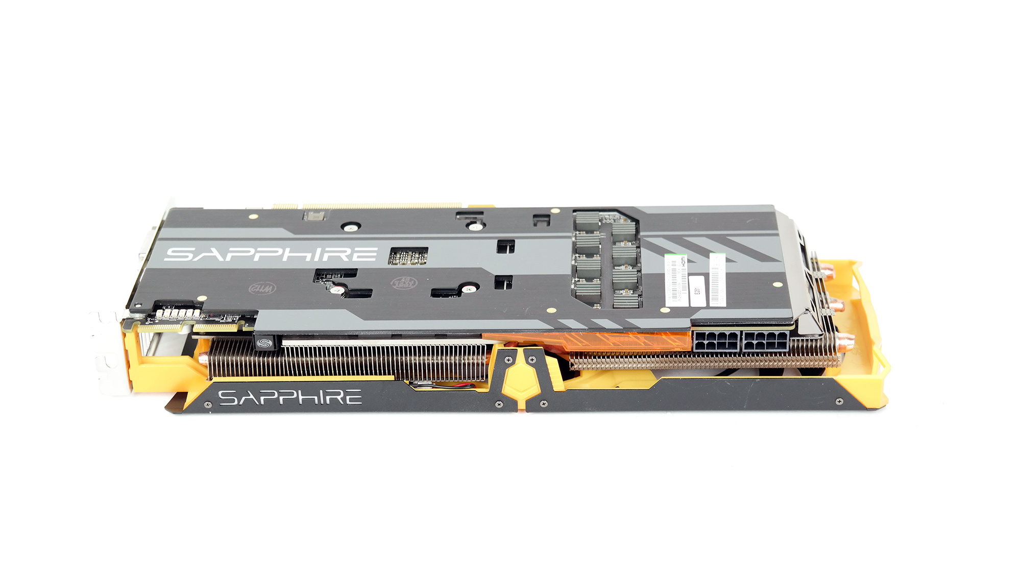 Sapphire har i annars typisk Nvidia-stil slängt in en ljusdiod bakom kylarens företagsnamn och med sitt gula sken ger det kortet lite extra karaktär. Vi hittar även en speciell Sapphire-märkt knapp som används för att växla mellan kortets traditionella BIOS och UEFI VBIOS som tyvärr inte vårt testkort var utrustat med.