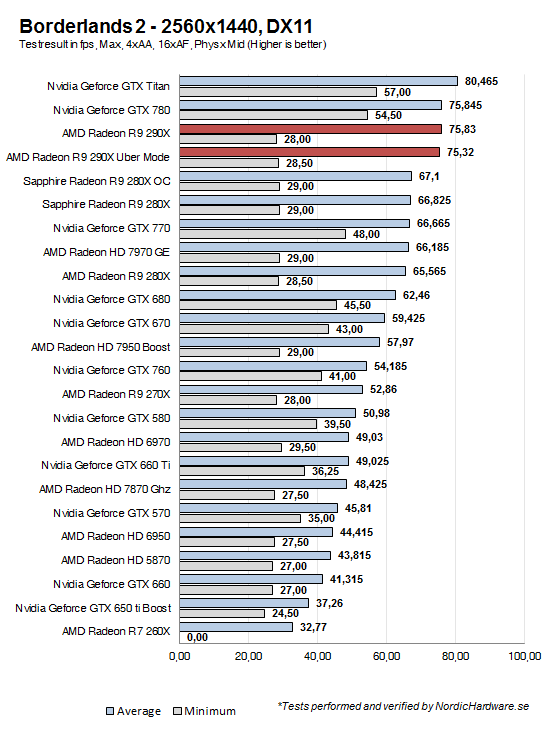 Borderlands 2 är betydligt mer hänsynslöst mot AMD:s deltagare, inte minst när det kommer till minimifrekvenserna. Nvidia-korten toppar listan, och AMD:s toppmodeller faller i spridda skurar längre ner, både i den lägre och högre upplösningen.