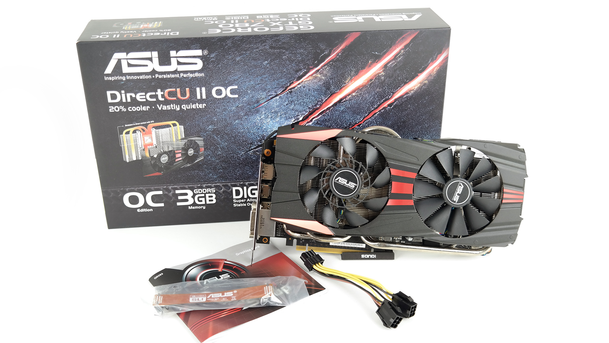 Som vanligt utrustat Nvidias partners sina Geforce-grafikkort med dubbla DVI, en fullstor HDMI samt en fullstor Displayport-anslutning. Grafikkortets tillbehör är återigen sparsamma och förutom mjukvaran GPU Tweak från Asus själva är det Nvidias nuvarande spelpaket man får nöja sig med.