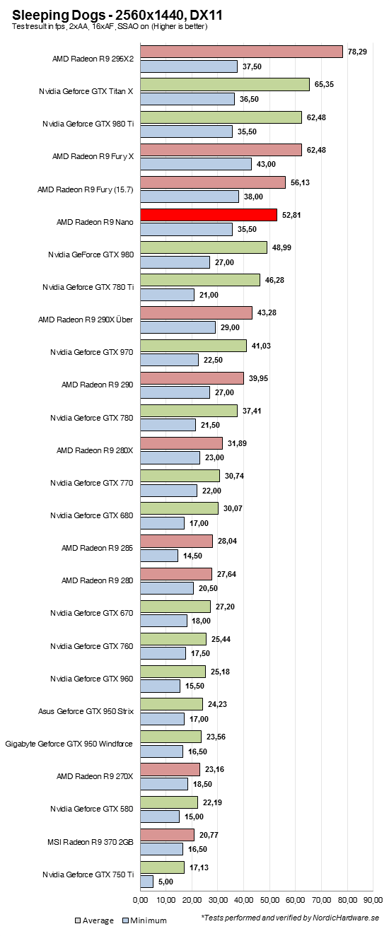 Kurvan är ganska jämn i Sleeping Dogs, men åter igen träder en bekant bild fram i båda upplösningarna. GTX 780 Ti från MSI, tätt följt av Gigabyte och Palit, är snabbast följt av referensmodellen av samma kort. Vi hittar även åter igen Asus i toppen av R9 290X-korten, men MSI och Gigabyte ligger inte långt därefter.
