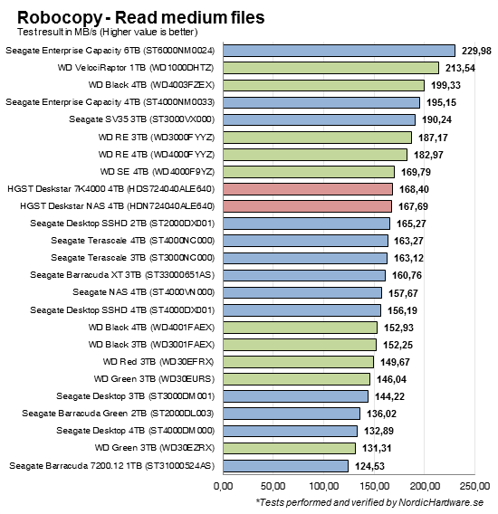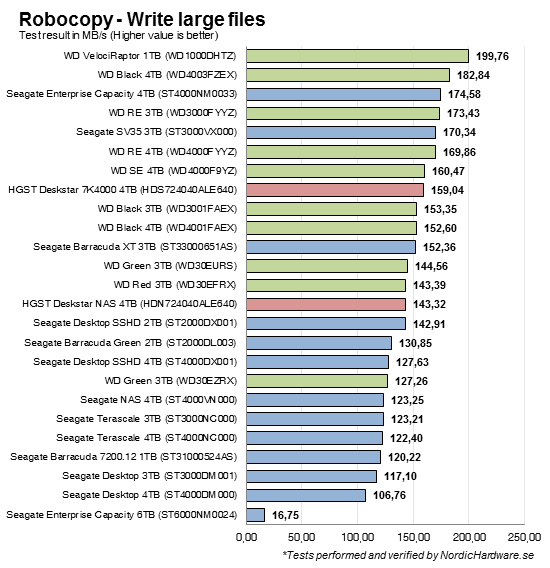 För att testa hårddiskarnas prestanda vid filkopiering av stora och medelstora filer använder vi oss av Robocopy, ett verktyg som finns inbyggt i Windows 7. Det här testet blir särskilt intressant för hårddiskar, även om vi också använder oss av det för våra SSD-tester, då hårddisken idag blir allt mer av ett masslagringsmedium där vi förvarar all vår mer utrymmeskrävande data.