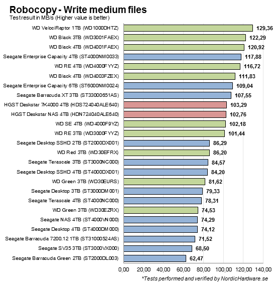 Vid skrivning av medelstora filer tycks Western Digital Black trivas bättre än arbetsstationsdiskarna och klättrar upp till en andraplats. Seagate SV35 trillar ner rejält och lägger sig bakom Barracuda 7200.12, medan Western Digital Velociraptor bibehåller en stadig förstaplats. Vi hittar Seagates hybriddisk Desktop SSHD omkring mitten av skalan med 86,29 megabyte per sekund.