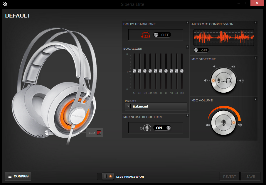 Mjukvaran känns väldigt genomarbetad och ger dig riktigt många användbara inställningar. Det finns inbyggd equalizer, dolby surroundläge, diverse mikrofonförbättringar samt ett reglage där du kan göra så att mikrofonens ljud återges i lurarna. Vill du ändra färg på belysningen, justera pulsering för att matcha musiken eller helt enkelt stänga av det så finns även dessa inställningar. Möjligheten finns att skapa egna profiler för olika tillfällen och program/spel. Programmet är även resurssnålt och tar bara någon enstaka megabyte i minne. Sist men inte minst kan du uppdatera enheters mjukvara på ett snabbt och smidigt sätt. Steelseries har lyckats mycket bra med mjukvaran och vi kan inte ge annat än en eloge här.