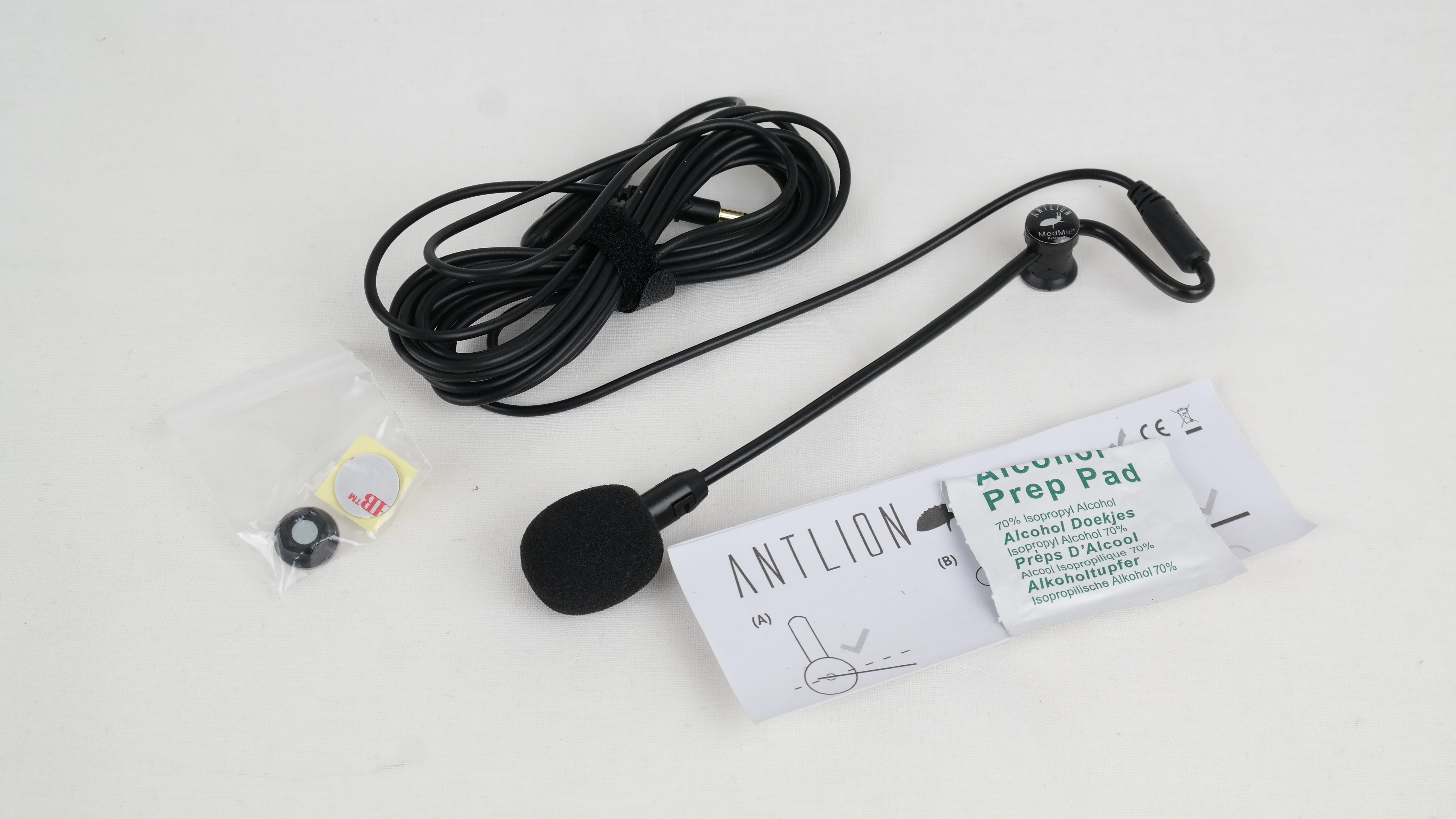 Inuti förpackningen finner vi mikrofonen, instruktionsmanual, fästanordning för ett extra headset samt en rengöringsduk försedd med 70% isopropylakolhol för rengöring av fästytan.