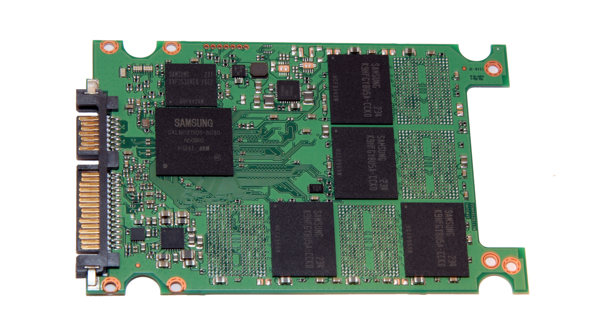 När vi har skruvat upp enheten så möts vi av ett relativt tomt kretskort. Förutom Samsungs MDX-kontroller så hittar vi endast fyra stycken minneskretsar. Dessa är givetvis också tillverkade av Samsung och har artikelnummer K9HFGY8U5A. Det är exakt samma minnen som sitter i 256GB-modellen men då sitter det 8 stycken istället för 4. Vi har också en DRAM-krets som även den är tillverkad av Samsung. Just denna har artikelnummer K4P2G324ED och är ett LPDDR2 minne på 256 megabyte.