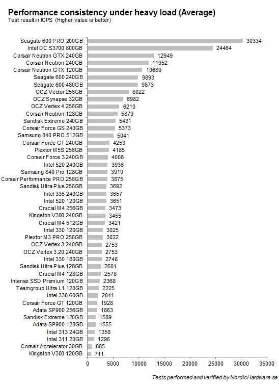 Corsair Neutron GTX är betydligt snabbare än konkurrenterna. En medelprestanda på 10 694 IOPS är verkligen inte fy skam med tanke på vad enheterna har utsatts för.
