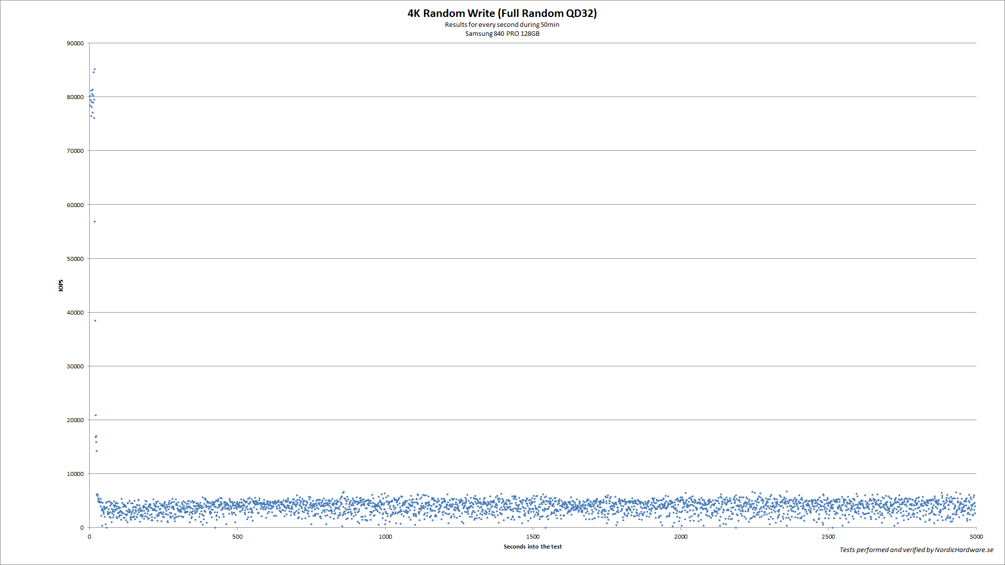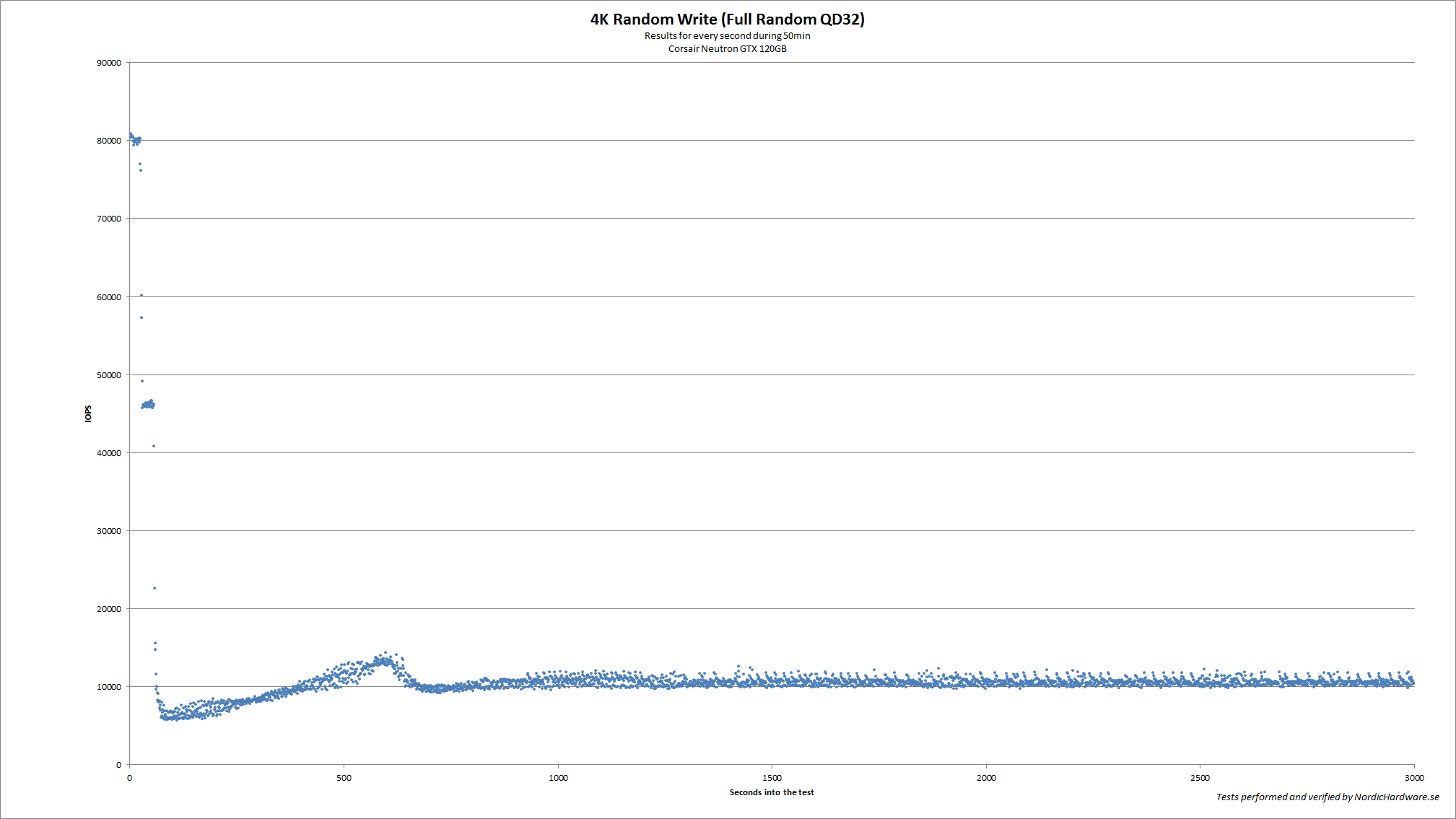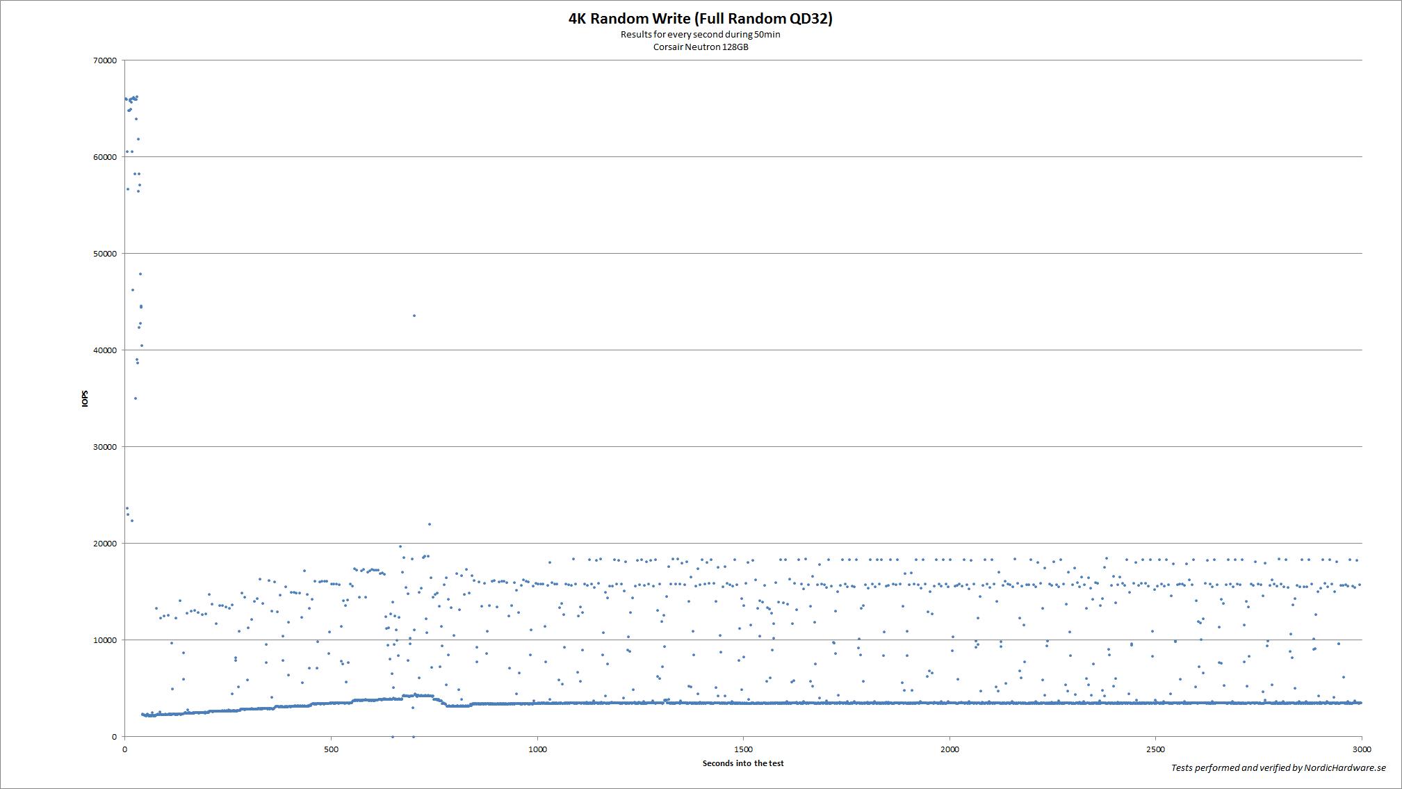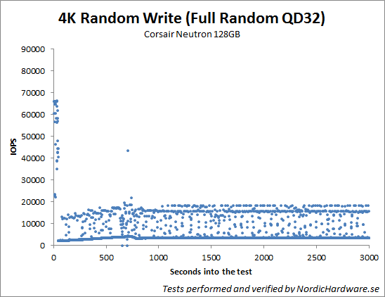 För att göra det här testet så började vi med att fylla hela enheten med data som ej går att komprimera. När det var gjort så bombarderade vi enheten med slumpmässiga skrivningar på 4KB och en QD på 32. testet pågick i hela 50 minuter och under den tiden så spelade vi in enhetens prestanda varje sekund. 3 000 sekunder är alltså 50 minuter.