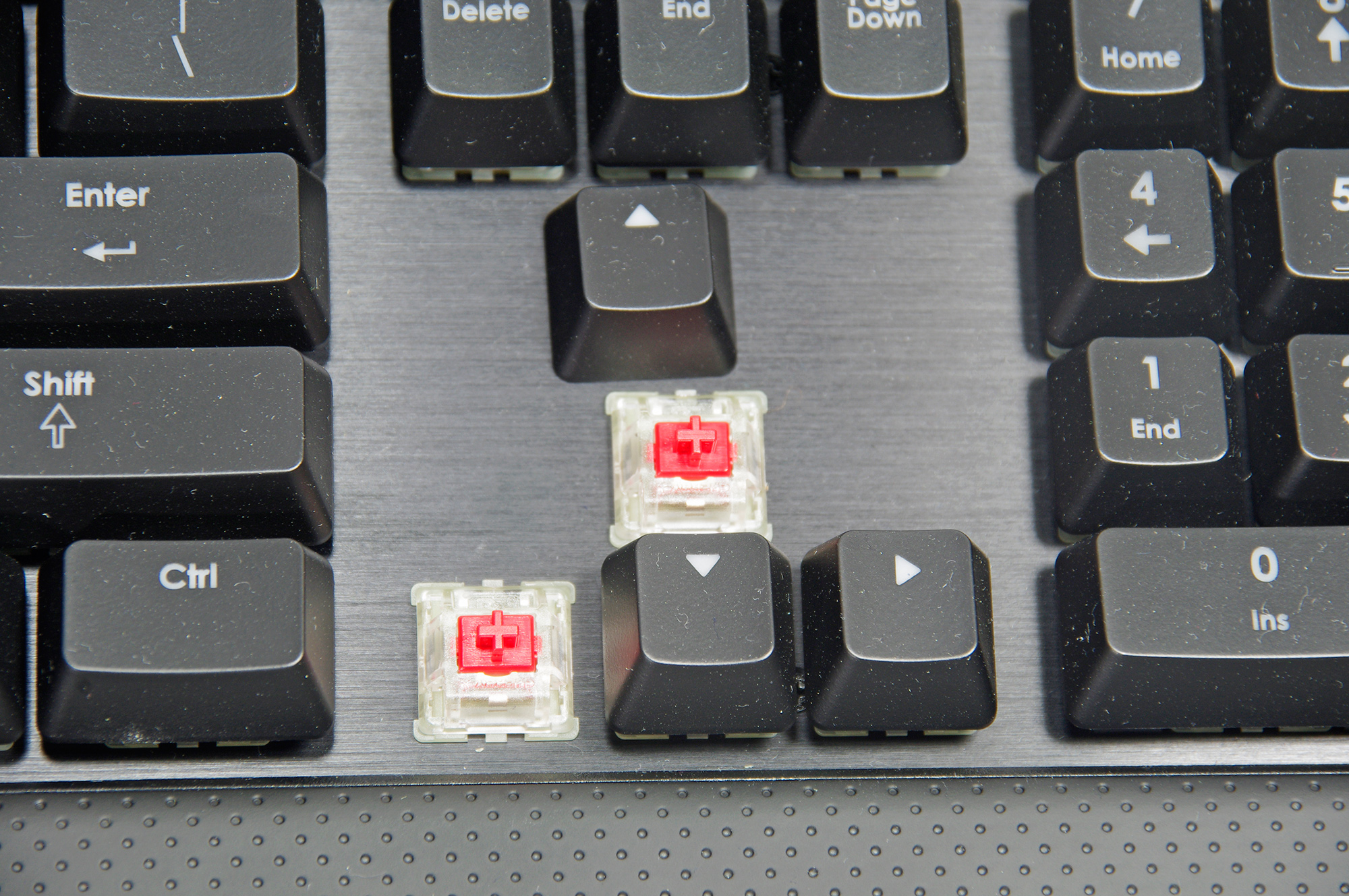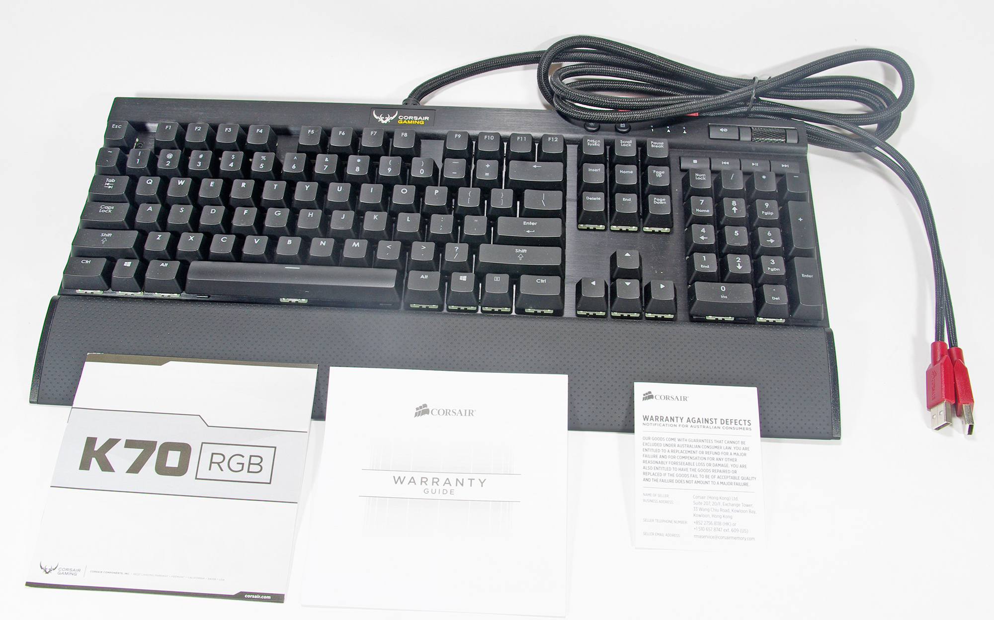 Corsair Gaming K70 RGB är utrustat med de nya Cherry MX RGB-brytarna. Vårt exemplar kommer med Cherry MX RGB Red, men även Cherry MX RGB Blue och Brown finns i utbudet. Känslan i brytarna är densamma som i vanliga Cherry MX brytare. Skillnaden är belysningen och hur denna integrerats i brytarna. Vanliga Cherry MX brytare är låsta till en färg, med Cherry MX RGB går det att välja mellan 16,8 miljoner olika färgnyanser. Tangentbordet har 105 full key rollover via USB vilket är bra att ha i spel när man kan behöva trycka ner många knappar samtidigt.