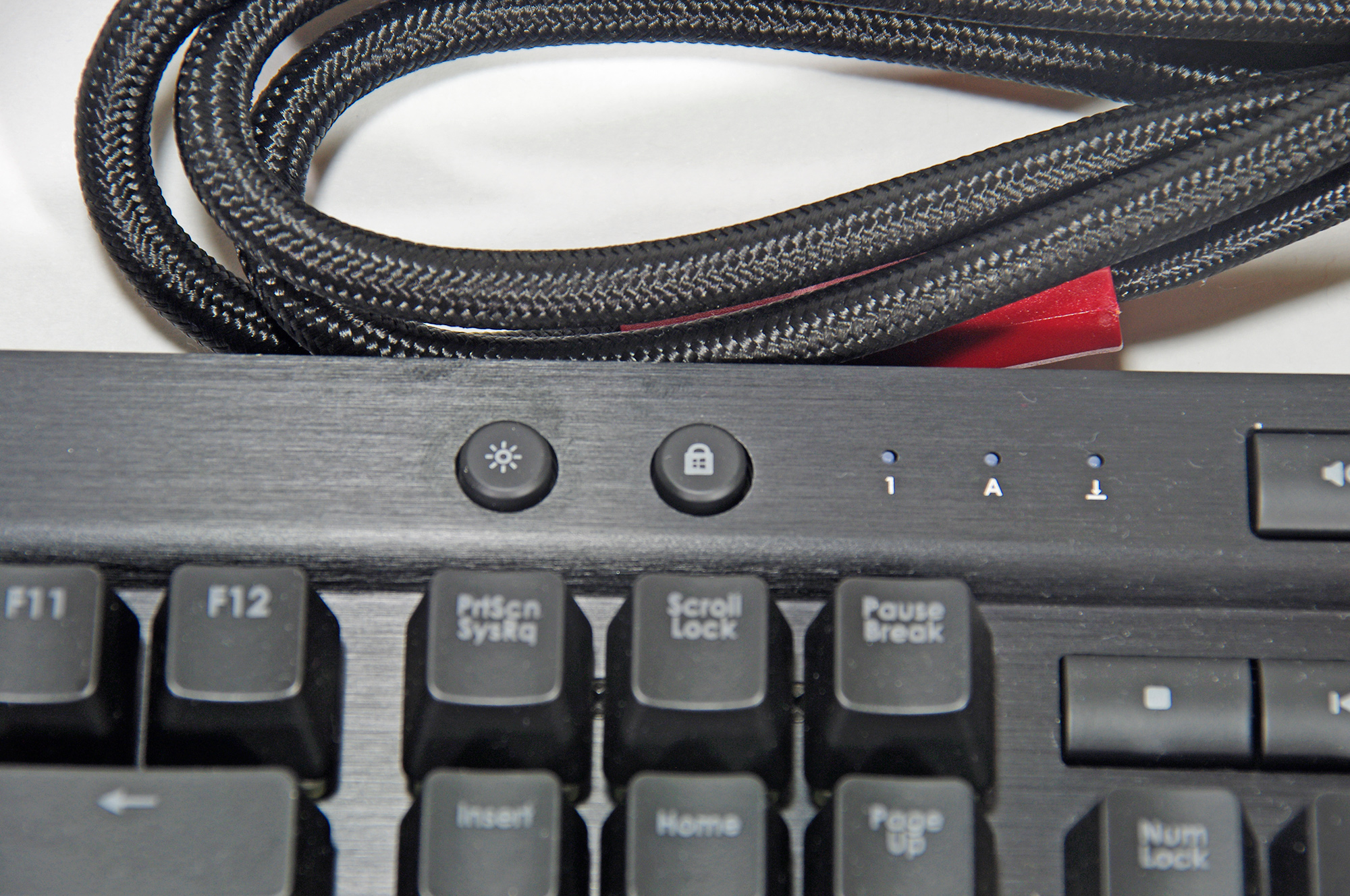 Innan man har kopplat in tangentbordet ser K70 RGB ut som en vanligt K70 med små detaljer som vittnar om att det här är något nytt. Logotypen är utbytt till den nya Corsair Gaming loggan. Brytarna är precis som på den föregående modellen monterade direkt på en aluminumplatta och kikar fram lite. Här kommer nästa detalj som visar på förändring. Vanliga Cherry MX brytare har ett hölje i svart, de nya Cherry MX RGB brytarna har ett transparent hölje. Detta gör att det syns lite tydligare än de tidigare varianterna men det är ett mindre bekymmer. I övrigt har inget förändras. Handledsstödet är fortfarande beklätt med en härlig gummiyta som också ser bra ut. Mediatangenterna har fortfarande en lite dum placering.