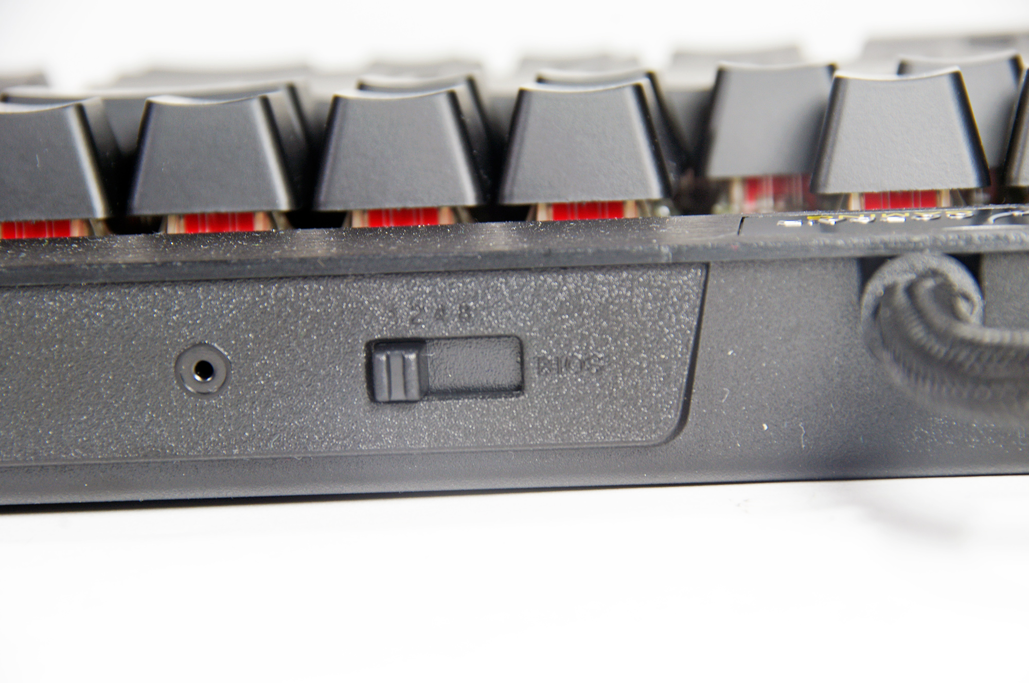 K70 RGB har ingen USB-port tyvärr, men tar ändå upp två USB-portar på datorn. Men en Switch för att ställa polling rate på tangentbordet finns. Det går att välja mellan 1, 2, 4 och 8 millisekunders polling rate. Det finns även ett BIOS-läge som sänker polling rate och stänger av full key rollover funktionen. Detta för att skapa bättre kompabilitet enligt Corsair.