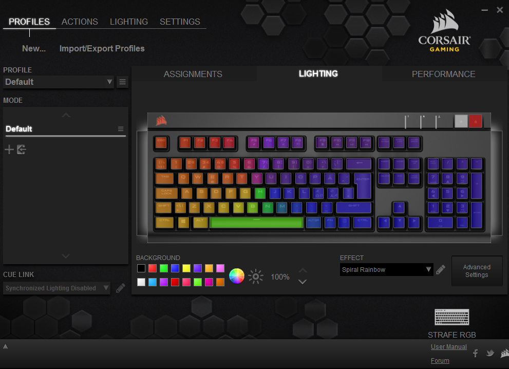 Corsair Strafe RGB använder Corsair Utility Engine, Corsairs alltiallo-mjukvara. Det är en bra mjukvara som bara blir bättre och bättre för varje gång vi testar den. Det är fortfarande komplex, men Corsair har arbetat med att göra det lite enklare att ställa in olika standardlägen på tangentbelysningen.