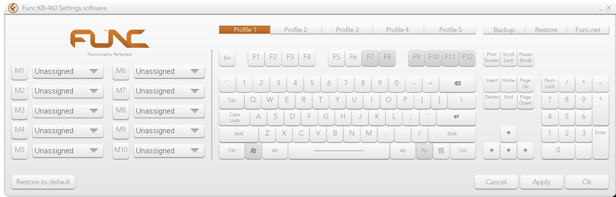 Func har gjort ett mediokert jobb när det kommer till mjukvaran för att vara ärlig. Den är estetiskt tilltalande att titta på och väldigt simpel. Den är enkel att använda för det den är utvecklad till att göra, att tilldela de tio virtuella makrotangenterna till en av tangentbordets tangenter, undantaget F7-F12, FN och windowstangenten. Funktionsmässigt så känns den väldigt lik Tesoros mjukvaror men i en snyggare förpackning och ett smartare upplägg. Men det går inte att spara makron i mjukvaran, utan den vill spara makron som separata filer och sedan ladda dessa filer, en väldigt klumpig lösning. När vi testar att spara och ladda makron så krashar programmet dessutom flera gånger. Mjukvaran är också seg på att spara inställningarna man har gjort till tangenterna.