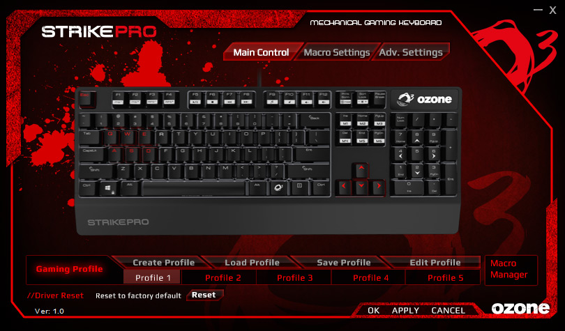Ozone har inte utvecklat någon universal mjukvara som fungerar till alla deras produkter som många av de stora företagen har. Mjukvaran till Strike Pro är simpel, det finns funktioner för att programmera om tangentbordets alla 105 knappar, ställa in makron. Sedan går det att ändra polling rate, responstid och ljusstyrkan i tangentbordet från mjukvaran istället för att göra det via snabbkommandona på tangentbordet. Utseendemässigt är mjukvaran inte alls lika stilren som tangentbordet utan är ganska flashig med blodstänk i bakgrunden.