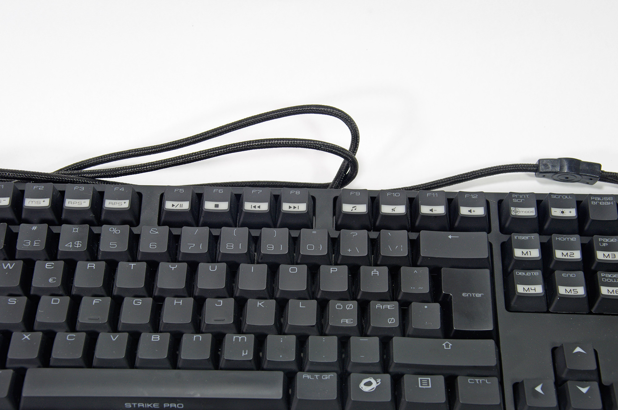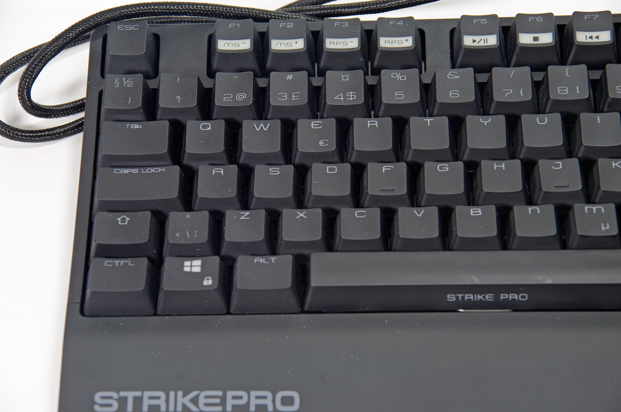 Strike Pro har exakt 105 tangenter. Det finns inte en enda extra tangent för varken mediastyrning eller makrofunktioner. Däremot har Ozone valt att lägga dubbla funktioner på alla F-tangenterna och på Home/delete-klustret. Håller man ner Ozone knappen brevid alt gr förvandlas f5-f12 till mediastyrning. Bortsett från de vanligaste har Ozone även lagt in en knapp som man kan starta t.ex. iTunes med. Under F1-F4 finns det styrning på polling rate och responstid i tangentbordet. Under Home/delete klustret finns det sex makroknappar som aktiveras när man aktiverar gaming mode.