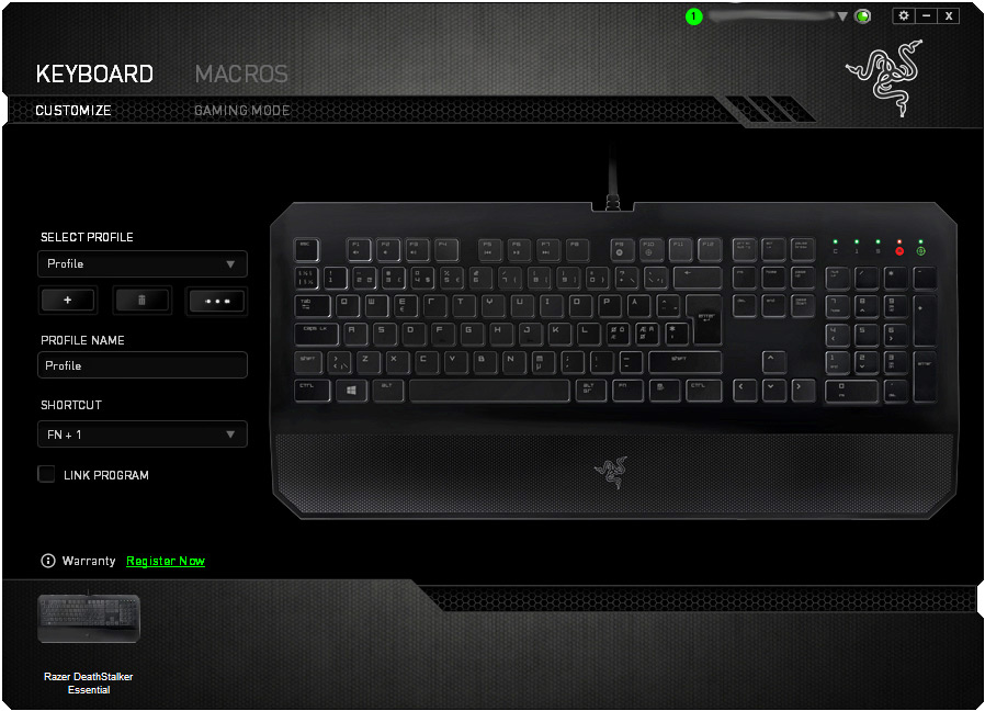 Deathstalker Essential har inga separata makrotangenter men det går samtidigt att programmera om varenda knapp på tangentbordet om man så vill. Det finns tyvärr inga profiler att växla mellan direkt på tangentbordet utan detta görs i mjukvaran, vilket gör att det blir omständigt om man har programmerat om halva tangentbordet för ett spel och helt plötsligt behöver skriva ett chattmeddelanden eller liknande. Mediafunktioner har Razer placerat på F-tangenterna och dessa aktiveras som vanligt med Fn-knappen.