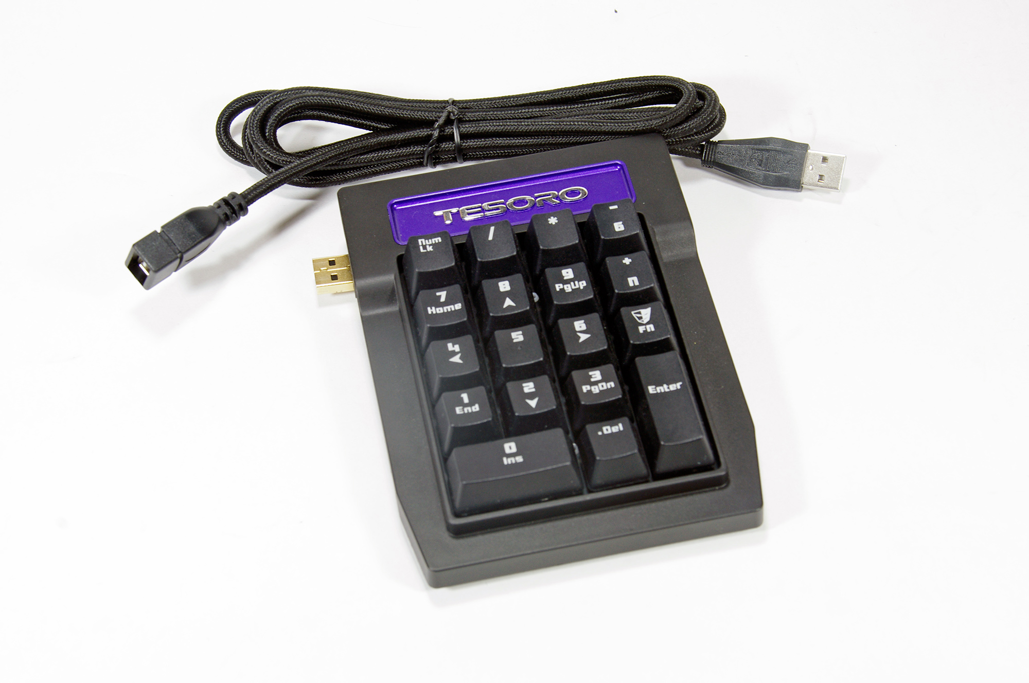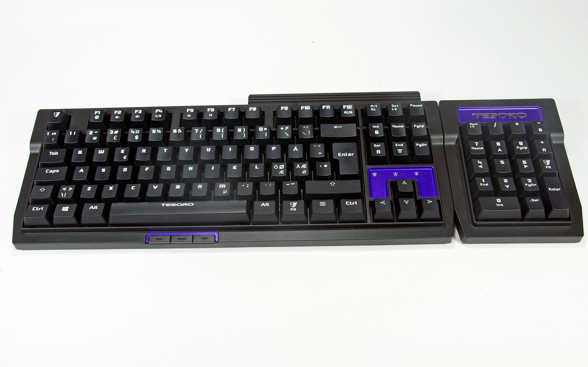 Till Tizona finns möjligheten att köpa till en numpad-enhet för de som önskar det. Till vårt testexemplar av tangentbordet fick vi också en separat numpad för att testa. Numpaden kommer märkt med Tesoros logga i kromade bokstäver på en lila bakgrund. Som tidigare nämnt går den att ansluta på vilken sida av tangentbordet du än föredrar. Så man kan använda delen som en vanlig numpad om man vill eller så kan man sätta den på vänstra sidan och plötsligt har man 18 extra knappar att använda till sina spel. Tyvärr finns det däremot ingen mjukvara till Tizona så det går inte att programmera om tangenterna vilket känns lite tråkigt. Numpaden är annars bra och även den utrustad med mekaniska brytare. Ett litet irritationsmoment är att det varken på tangentbordet eller på numpadenheten f inns någon diod som indikerar om numlock är aktiverat.