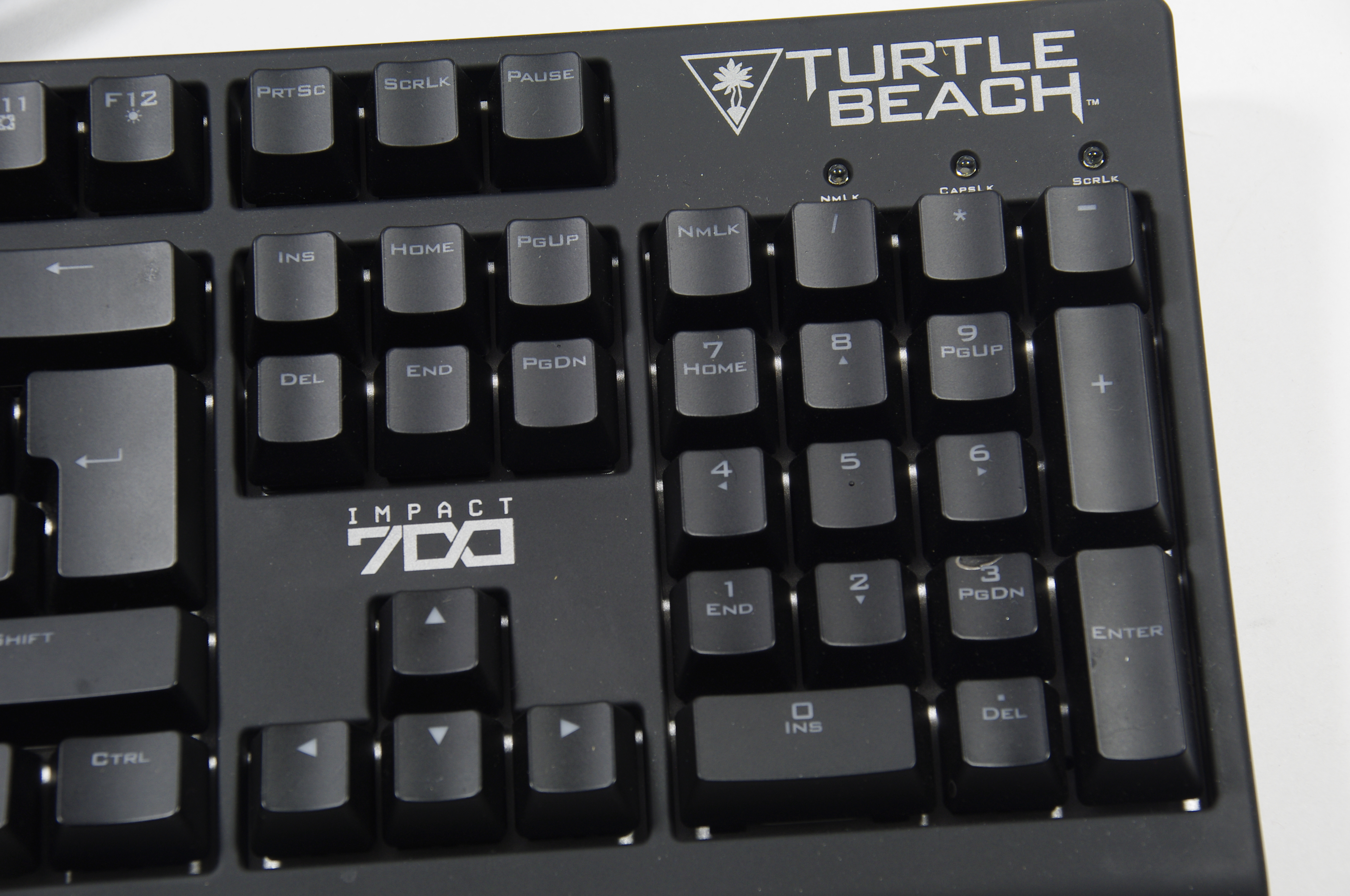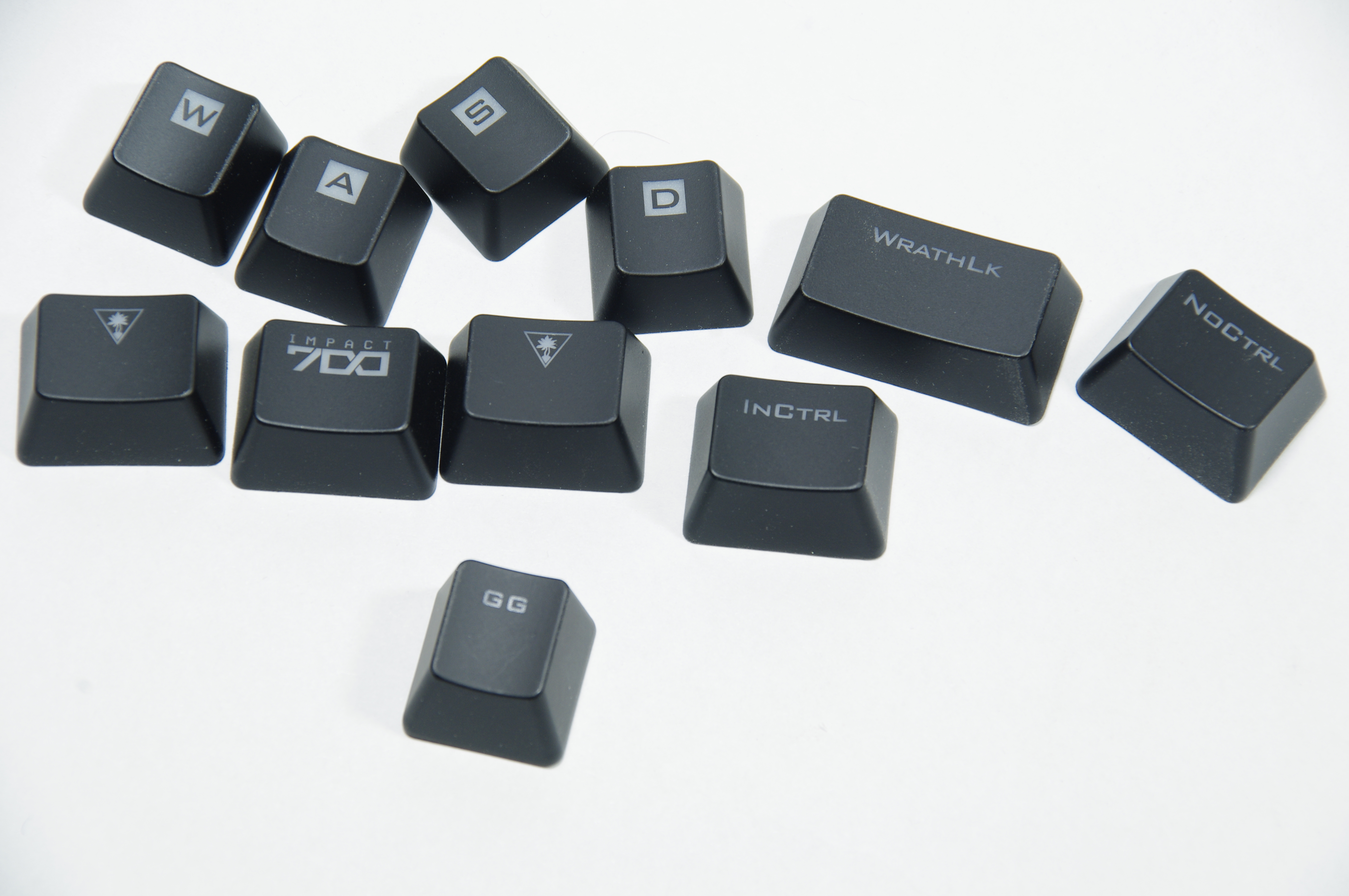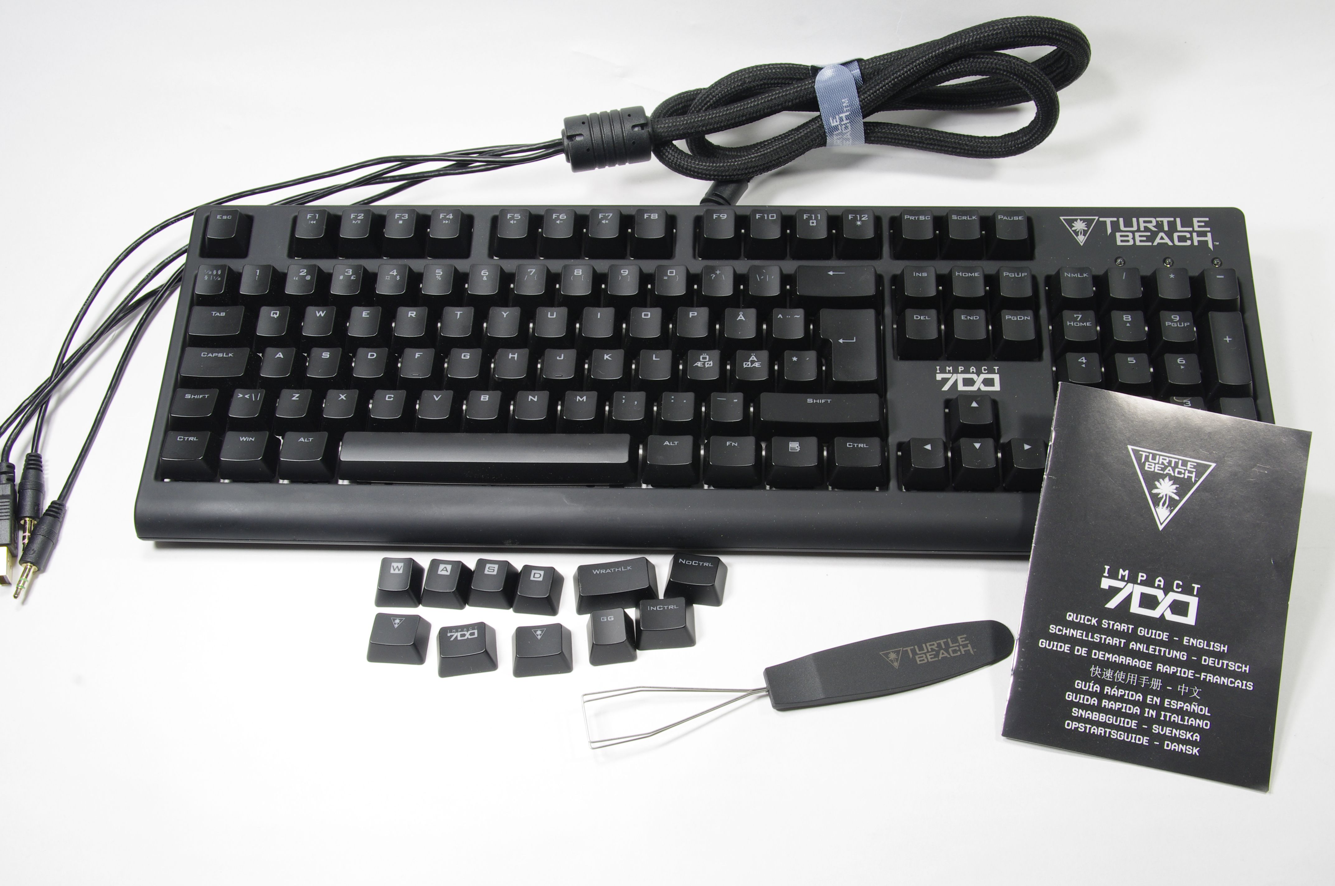 Turtle Beach bjuder inte på någon mjukvara till Impact 700, utan man får ett plug-and-play-tangentbord där allting fungerar från start, och man kan inte konfigurera vidare mycket. Till Turtle Beach Impact 700 får man däremot med elva stycken alternativa tangentoppar. Fyra av dessa är vanliga WASD-toppar med texten i en box, tre stycken är logotyper som kan sättas på ctrl, windows, alt, vänster-shift och de andra tangenterna på nedre raden. De sista fyra alternativa tangenttopparna är mer humoristiska, NoCtrl och InCtrl passar på samma tangenter som logotyp-topparna. Till sist har vi en alternativ caps-lock tangenttopp med texten Wratlock och en vanlig tangetopp med texten GG (förkortning för Good Game). Givetvis följer ett verktyg med för att plocka bort tangenttoparna enkelt.