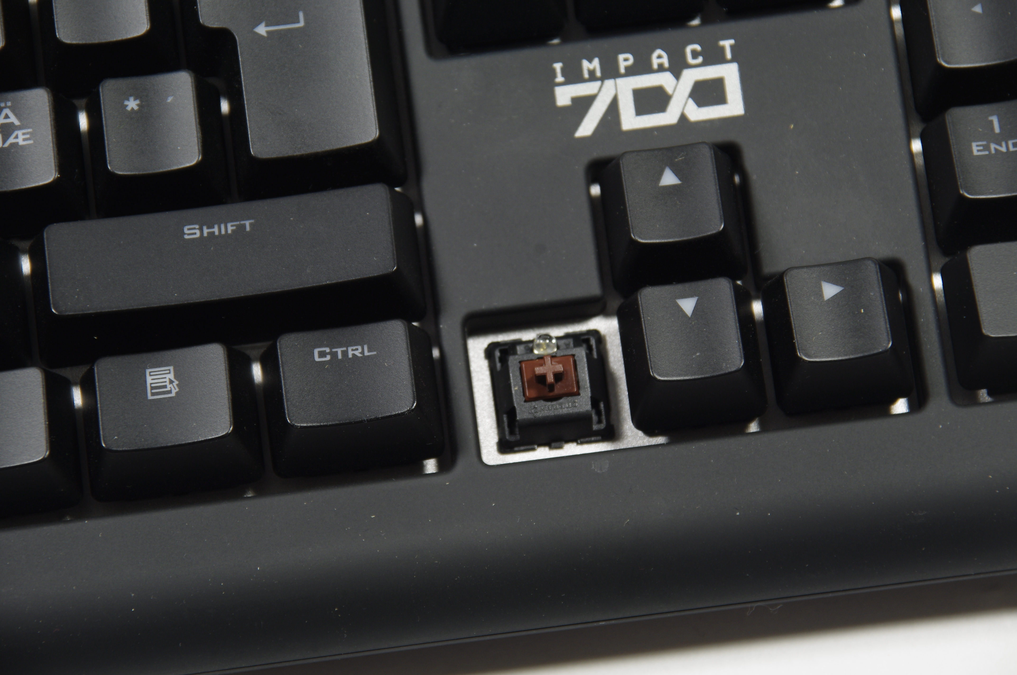 Under tangettopparna på Impact 700 sitter de populära Cherry MX-brytarna, här i varianten Cherry MX Brown. Brytarna är precis som man kan förvänta sig av Cherry MX-brytare av hög kvalitet och fungerar precis som en kvalitativ mekanisk brytare ska fungera. Tangentbordet har 6-keyrollover och full anti-ghosting. Responsen är god och vi kan inte upptäcka några direkta felaktiga tangentregistreringar eller uteblivna registreringar som beror på dålig rollover eller anti-ghosting så brytarna på det här tangentbordet fungerar helt klart godkänt.
