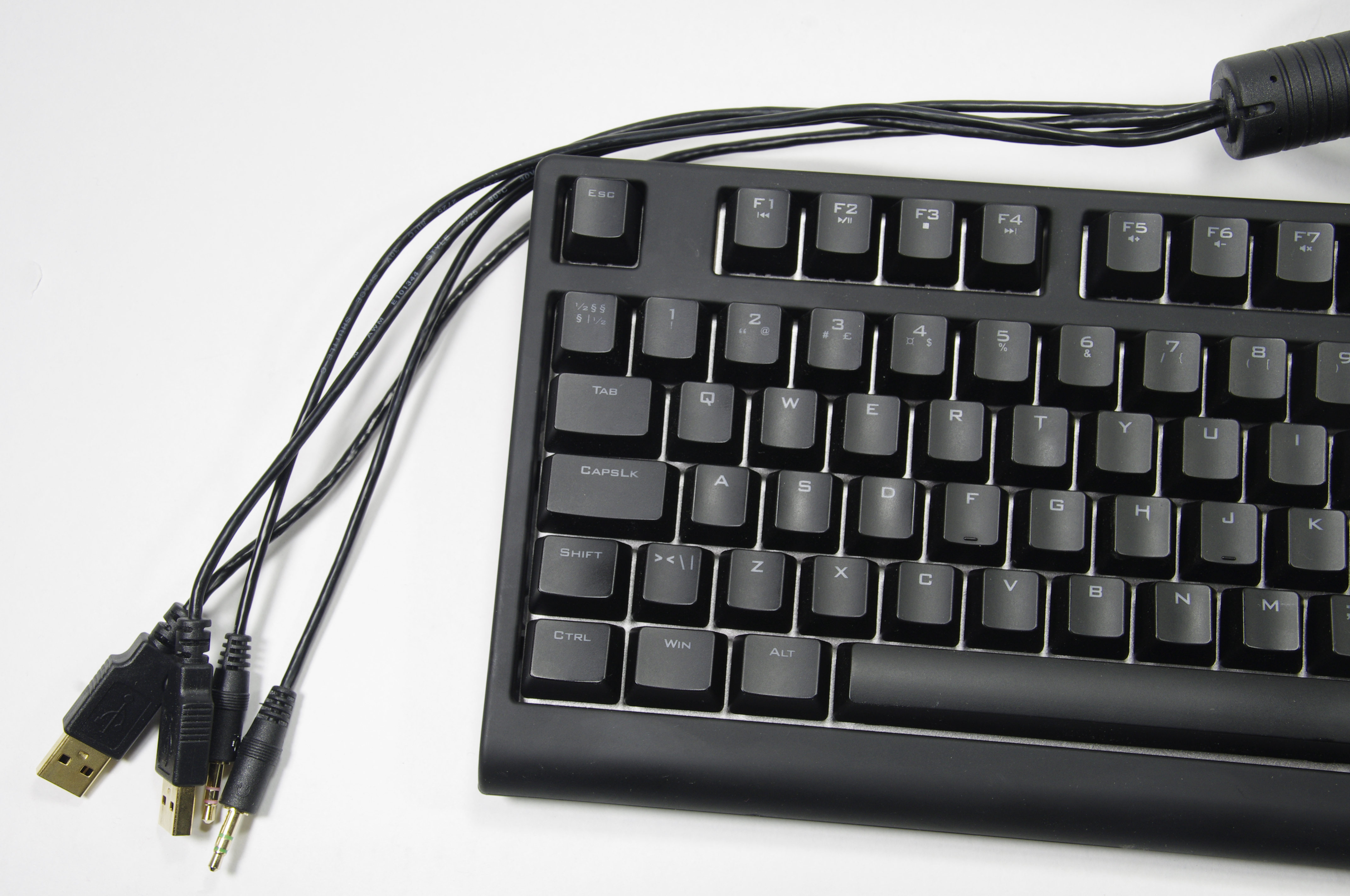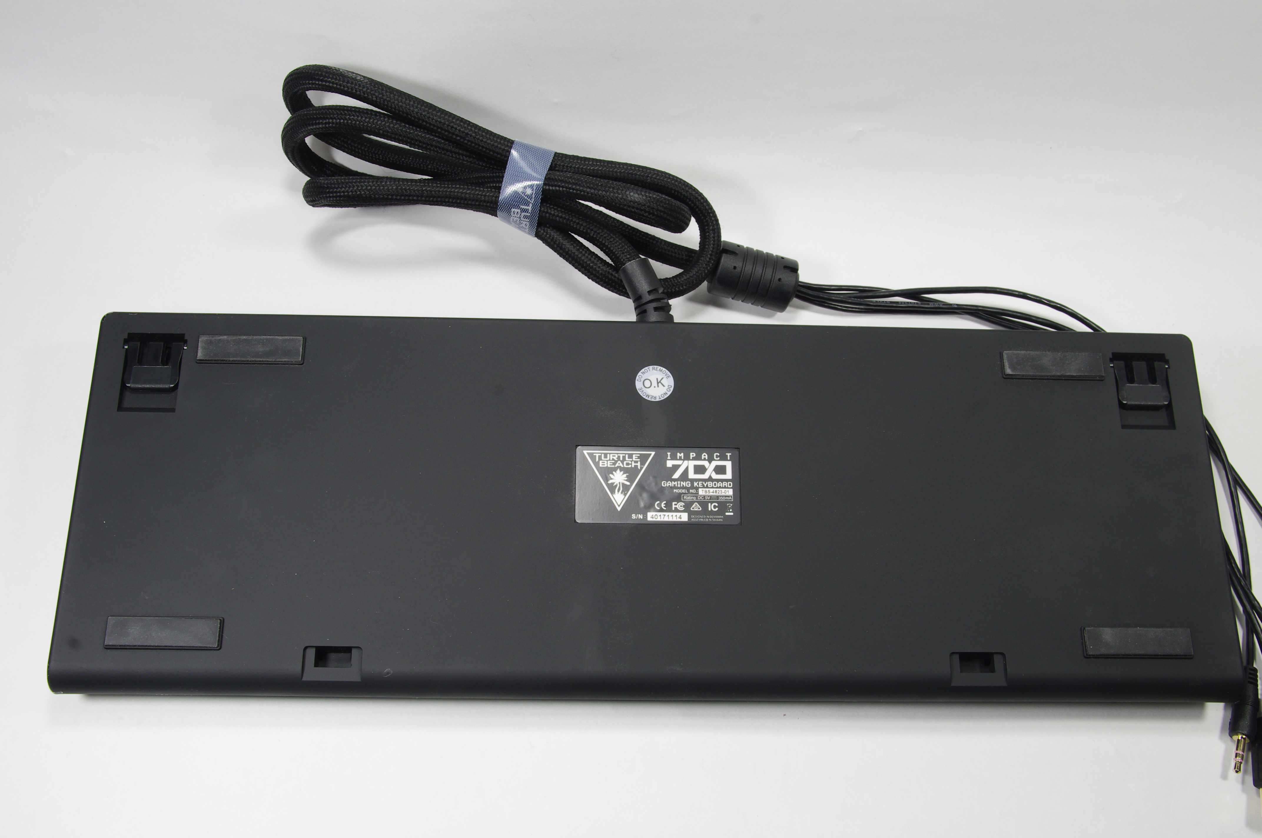 Om man trycker lite försiktigt på Impact 700 loggan, som sitter placerad precis ovanför piltangenterna, så sviktar skalet rejält. Inte heller den mattsvarta ytfinishen som tangentbordet har verkar vara av särskilt hög kvalitét, på vårt exemplar kan vi redan se indikationer på att färgen börjar nötas bort på vissa ställen. Ett plus i kanten för byggkvalitén är fötterna för att höja tangentbordet i bakkant, de känns åtminstone rejäla. Tangentbordet har en rejäl kabel som sedan delar upp sig till två 3,5-millimeters och två USB 2.0-kontakter. Problemet med så pass tjocka kablar är att de är lite svåra att forma och lägger sig lite som de vill.