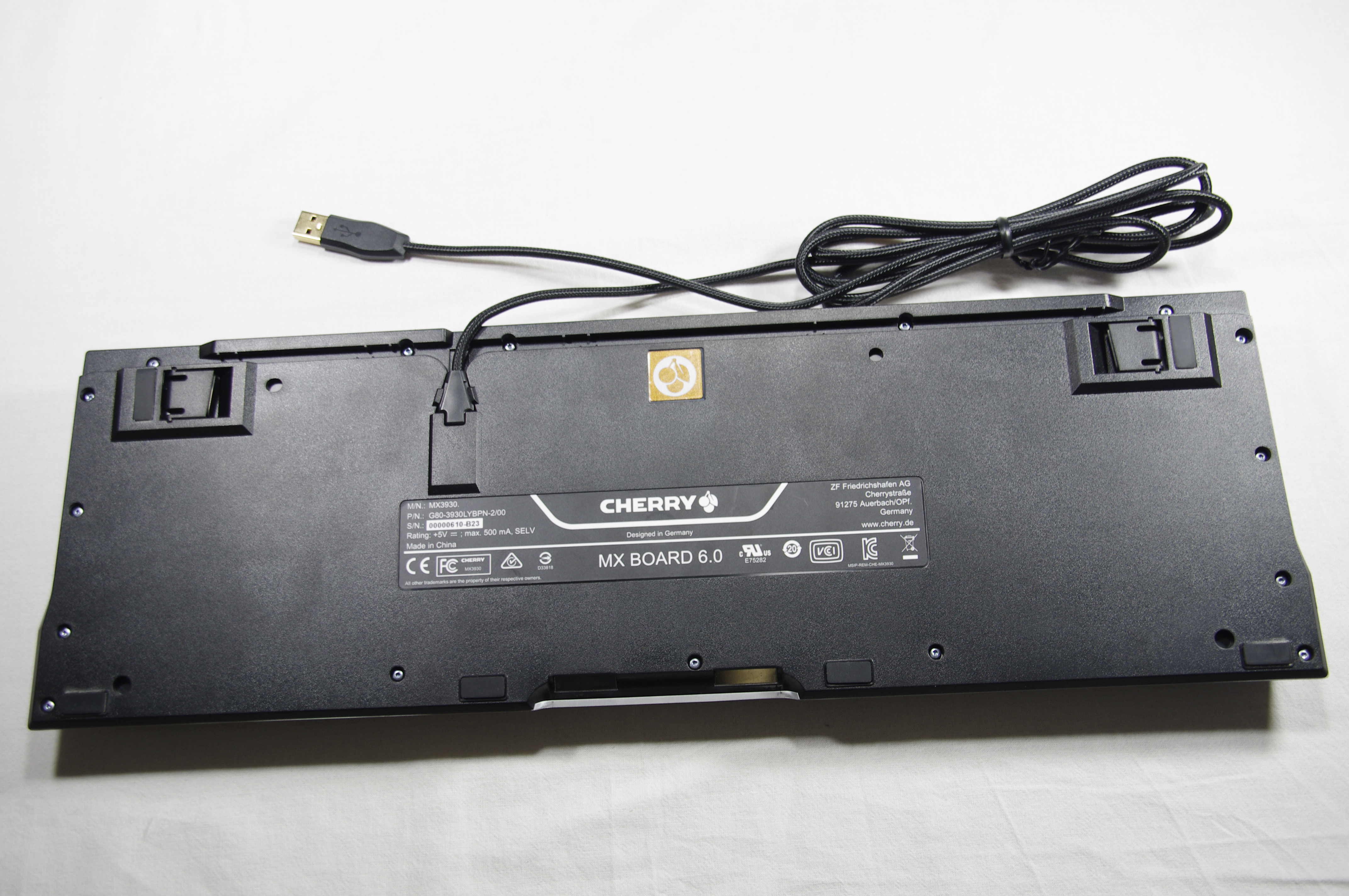 På undersidan av tangentbordet hittar vi kabelkanaler så USB-kabeln kan dras åt höger, vänster eller rakt bakåt. Det finns även två rejäla pluppar för att höja tangentbordet i bakkant och få en bekvämare lutning.