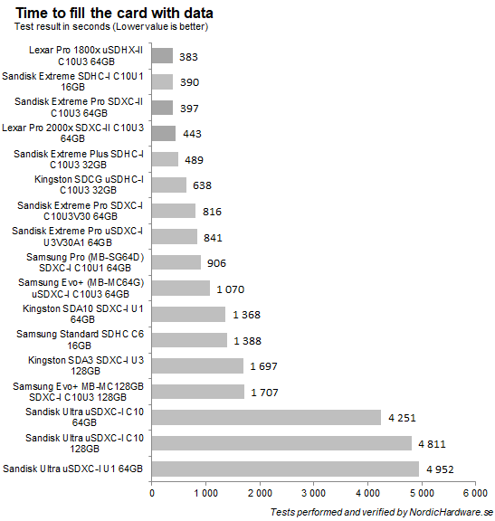 Att fylla hela kortet är något som slår ut eventuella trick med SLC och liknande funktioner. Det gör också att mindre kort får bättre resultat så försök att ha det i åtanke när ni tittar på ovanstående diagram. Precis som tidigare så är det UHS-II korten om är snabbast tillsammans med de lite äldre (och mindre) Sandisk Extreme korten.