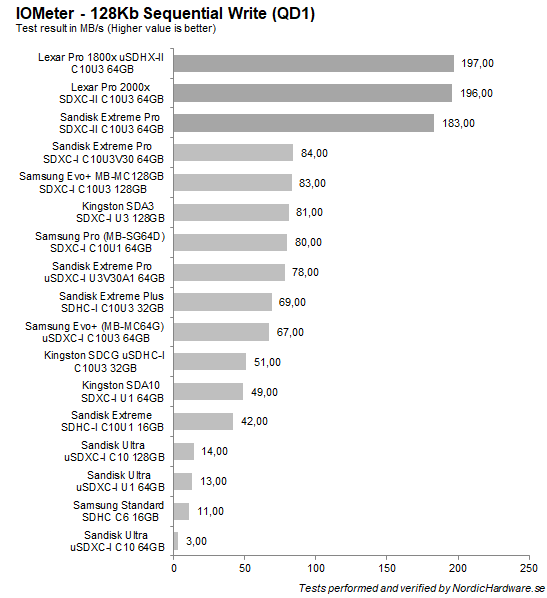 Olika kort är bra för olika saker och därför har vi valt att dela upp våra prestanda tester i tre olika kategorier. Sekventiell skrivprestanda, sekventiell läsprestanda samt applikation och systemprestanda. Sekventiell prestanda är viktigast för de som vill ha ett kort till någon form av kamera eller vanlig datalagring. Exempelvis om du har en kamera som kan spela in i 4K-upplösning så måste du ha ett kort som klarar av att skriva kontinuerligt i en viss hastighet. Läsprestanda är viktigt när man vill få ut den information som man redan lagrat. Du behöver exempelvis hög läsprestanda för att kunna snabbt importera nya bilder/klipp till dina projekt och föra över dem till din dator.