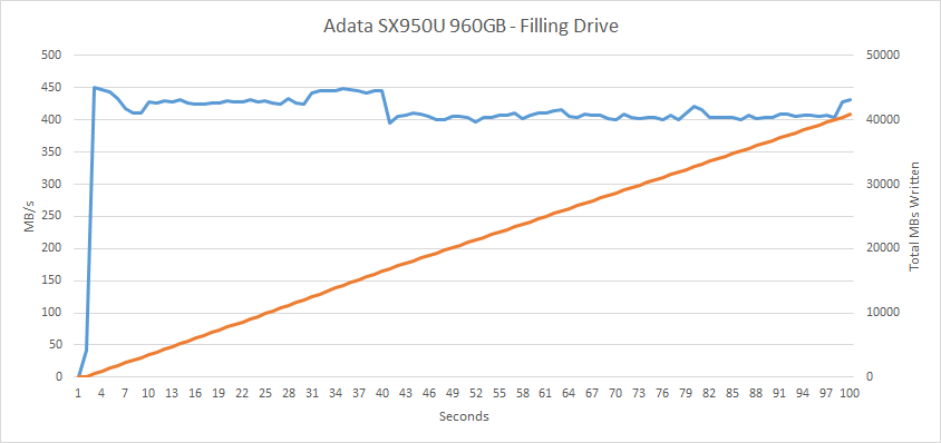 240GB-modellen lyckas bara hålla skrivprestandan hög under en väldigt kort stund. Vi kan bara skriva ungefär 2GB med data innan prestandan sjunker, och tyvärr sjunker den ganska rejält. Det ser också ut som att alla skrivningar måste göras till SLC. Det betyder att ny data måste invänta att cachen töms till TLC innan den går vidare. Detta är ett bra sätt att minska slitaget på minneskretsarna. 3D-TLC tål dock betydligt mer än gamla 2D-TLC så ska det inte vara något problem och Adata borde istället ha implementerat att ny data skrivs till TLC direkt när SLC-delen är full. Istället får vi riktigt dålig prestanda så fort cachen är full.
